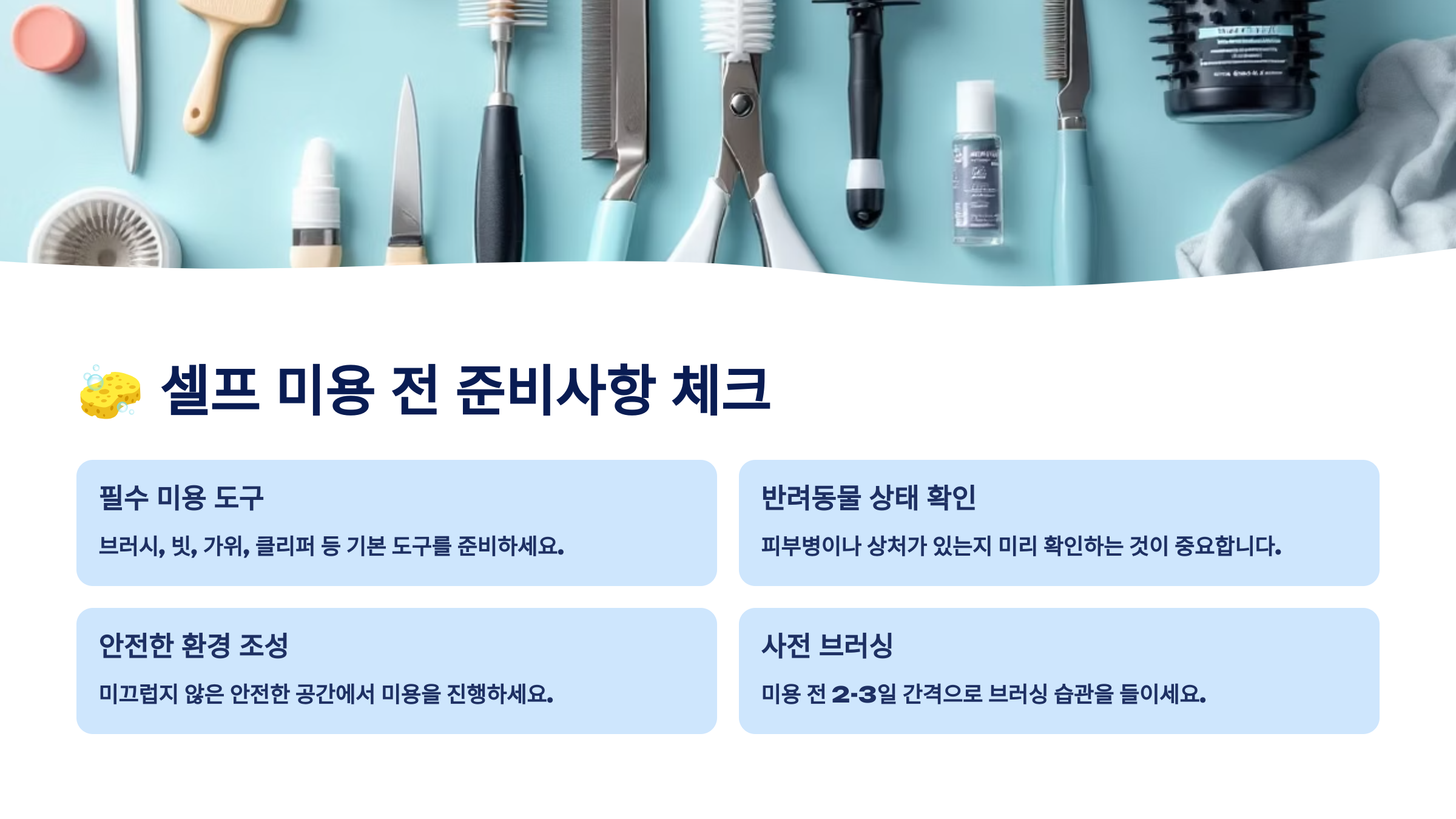 📦 셀프 미용을 시작하기 전 가장 중요한 건, 도구보다 심리적인 준비와 아이의 컨디션 확인이에요. 아무리 좋은 기구가 있어도 아이가 불안해하거나 낯선 상황에 당황하면 오히려 더 위험해질 수 있어요.