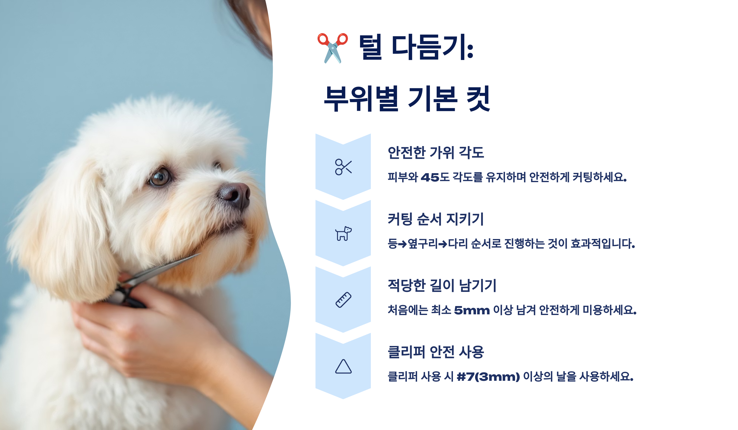 📌 아래 표는 부위별 기본 커팅 포인트와, 절대 주의해야 할 커팅 실수와 피해야 할 행동을 정리했어요. 안전이 최우선이에요! 🧡🐶