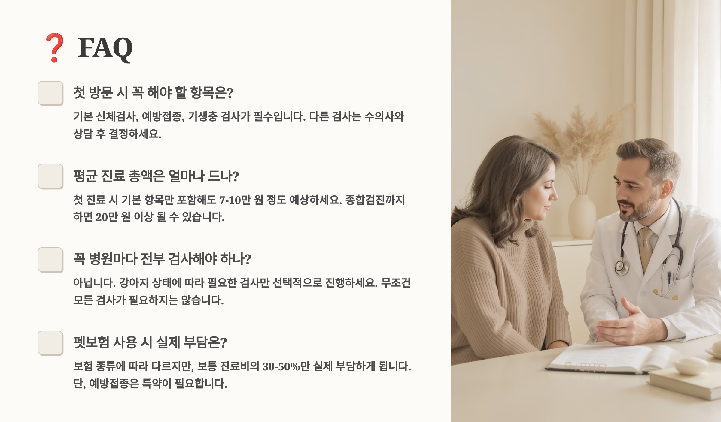 나의 경험상 첫 진료 때 이런 기본 검사들을 모두 받는 게 장기적으로 봤을 때 오히려 경제적이에요. 나중에 문제가 발견되어 치료하는 것보다 예방과 조기 발견이 훨씬 비용도 적게 들고 강아지도 덜 고생한답니다. 특히 어린 강아지일수록 질병 진행이 빠르기 때문에 초기 발견이 정말 중요해요.