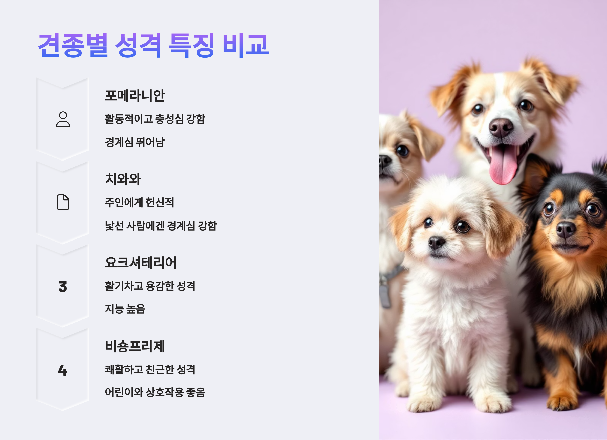 이제 어떤 소형견이 초보자에게 잘 맞을지 느낌이 오죠? 다음은 이 견종들의 성격을 좀 더 깊이 비교해볼게요! 🧠