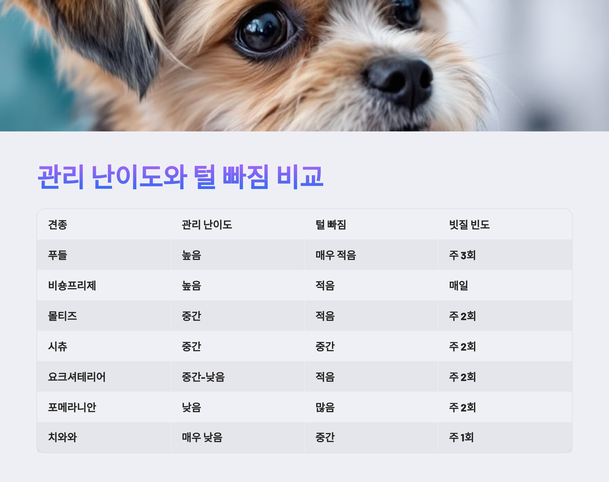| 견종 | 털 빠짐 | 미용 필요도 | 집에서 관리 난이도 |