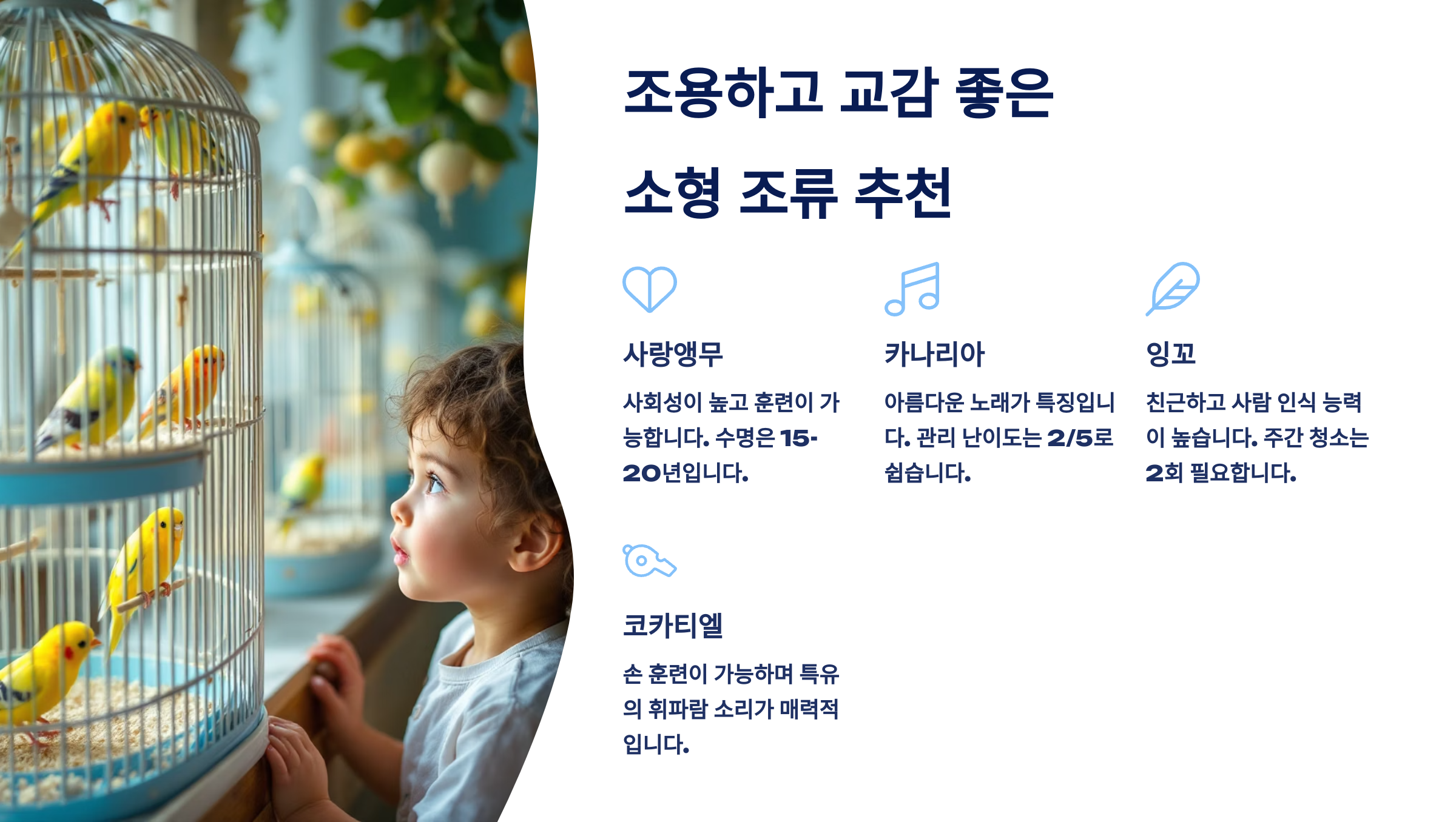 다만, 조류는 일부 품종이 크고 시끄러워 아이와 키우기엔 부담스러울 수 있어요. 소형, 온순, 교감이 쉬운 품종을 고르는 게 핵심이에요. 🔍