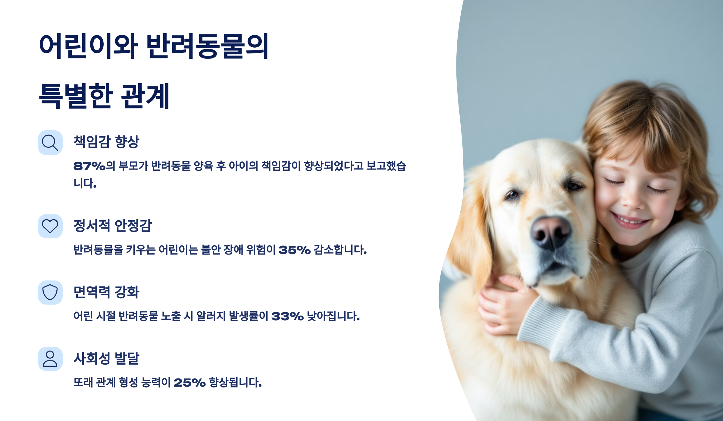 미국 아동심리학 연구에 따르면 반려동물을 키우는 아이는 스트레스 반응이 낮고 사회성이 높다고 해요. 혼자 노는 시간보다 동물과 놀면서 감정을 나누는 경험은 아이의 뇌 발달에도 긍정적인 영향을 준다고 하죠. 🧠💡