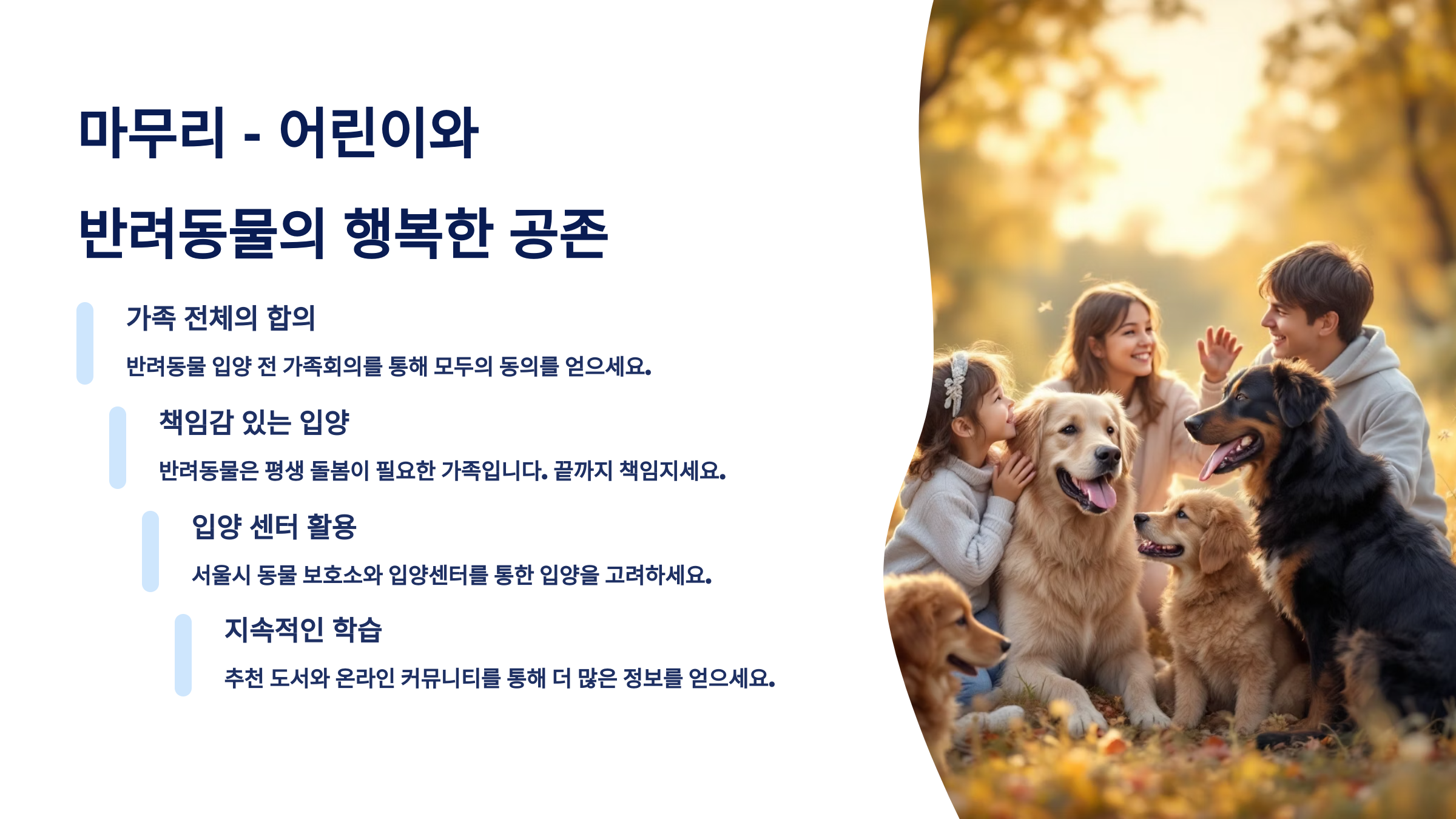 아이와 반려동물을 함께 키운다는 건 단순한 동거 그 이상의 경험이에요. 생명에 대한 존중, 감정의 교류, 책임감을 배울 수 있는 아주 특별한 가족의 형태가 되는 거죠. 🐾👨👩👧👦