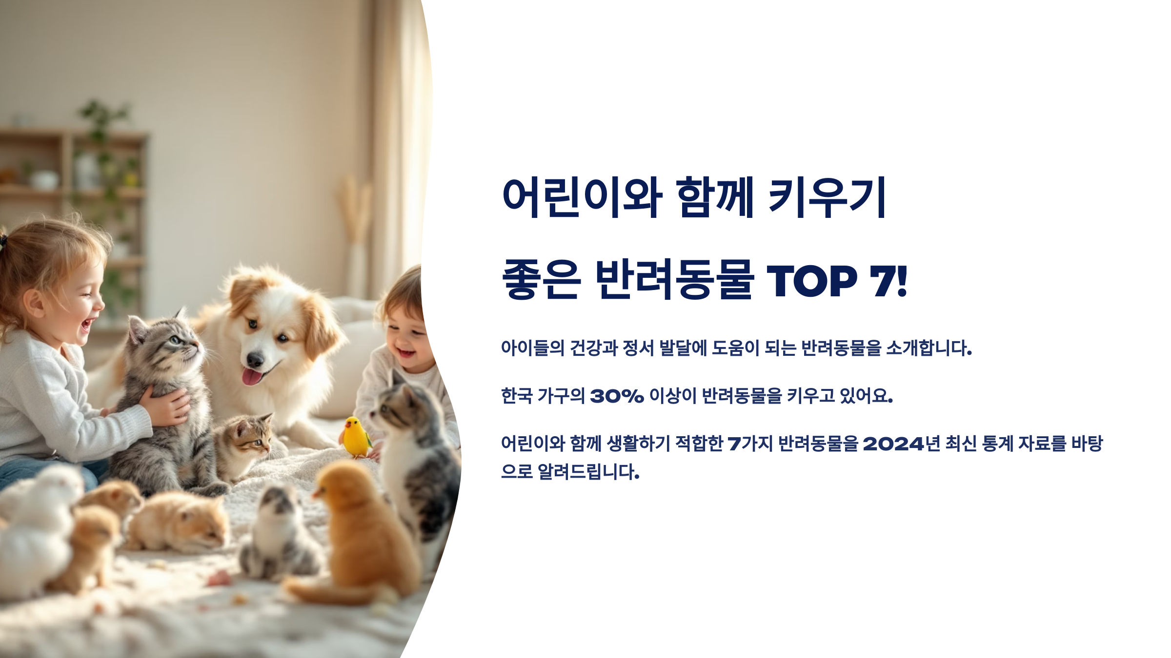 이 기준들을 바탕으로 하면 아이와도 안전하고 즐겁게 지낼 수 있는 이상적인 반려동물을 찾을 수 있어요! 이제 본격적으로! 어린이에게 가장 잘 맞는 반려동물 TOP7을 소개해볼게요! 🐶🐱🦜🐢