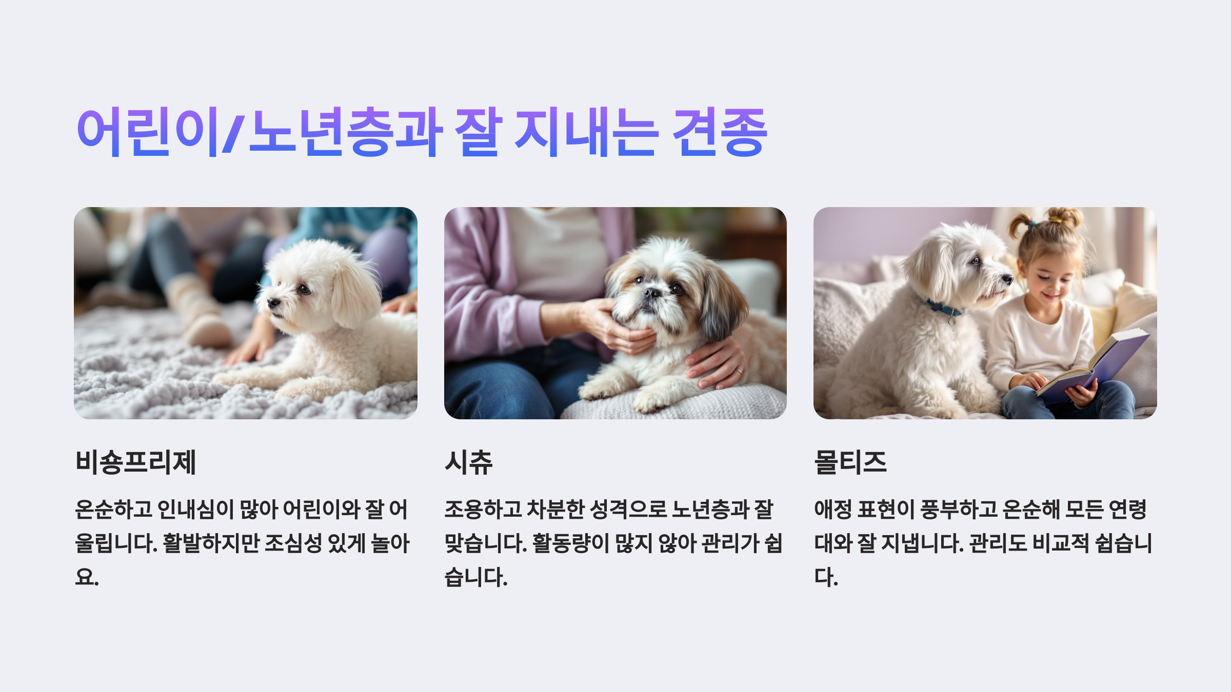 | 어린이 있는 가정 | 비숑 프리제, 말티즈, 푸들 | 사람을 좋아하고 장난 잘 받아줌 |