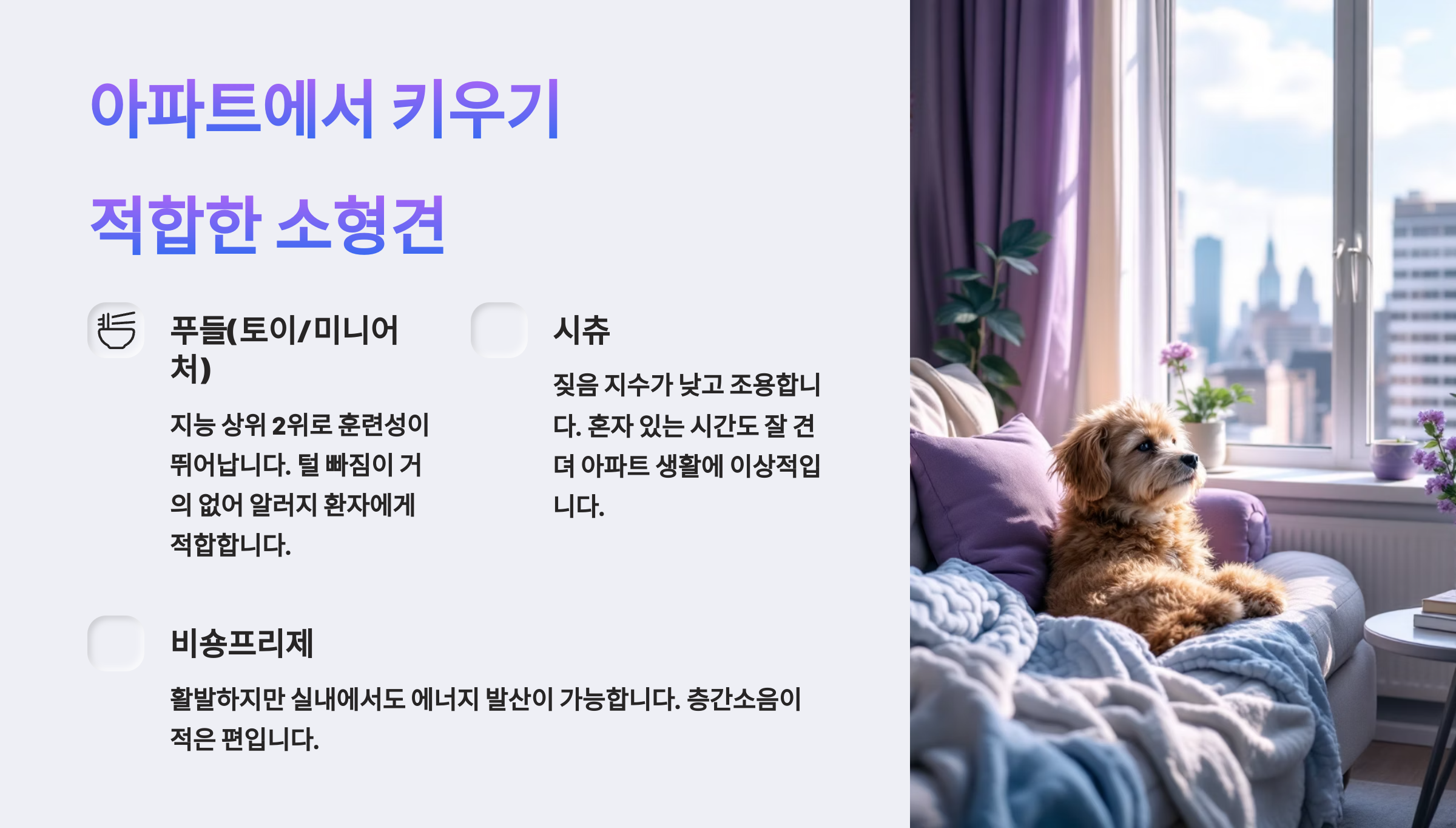 아파트에서 함께 살기 좋은 견종은 시츄, 말티즈, 비숑 프리제가 가장 안정적인 편이에요. 짖음이 크거나 예민한 아이는 훈련을 병행해줘야 해요! 이제 다음은 훈련 난이도 비교로 넘어갈게요! 🧠📚