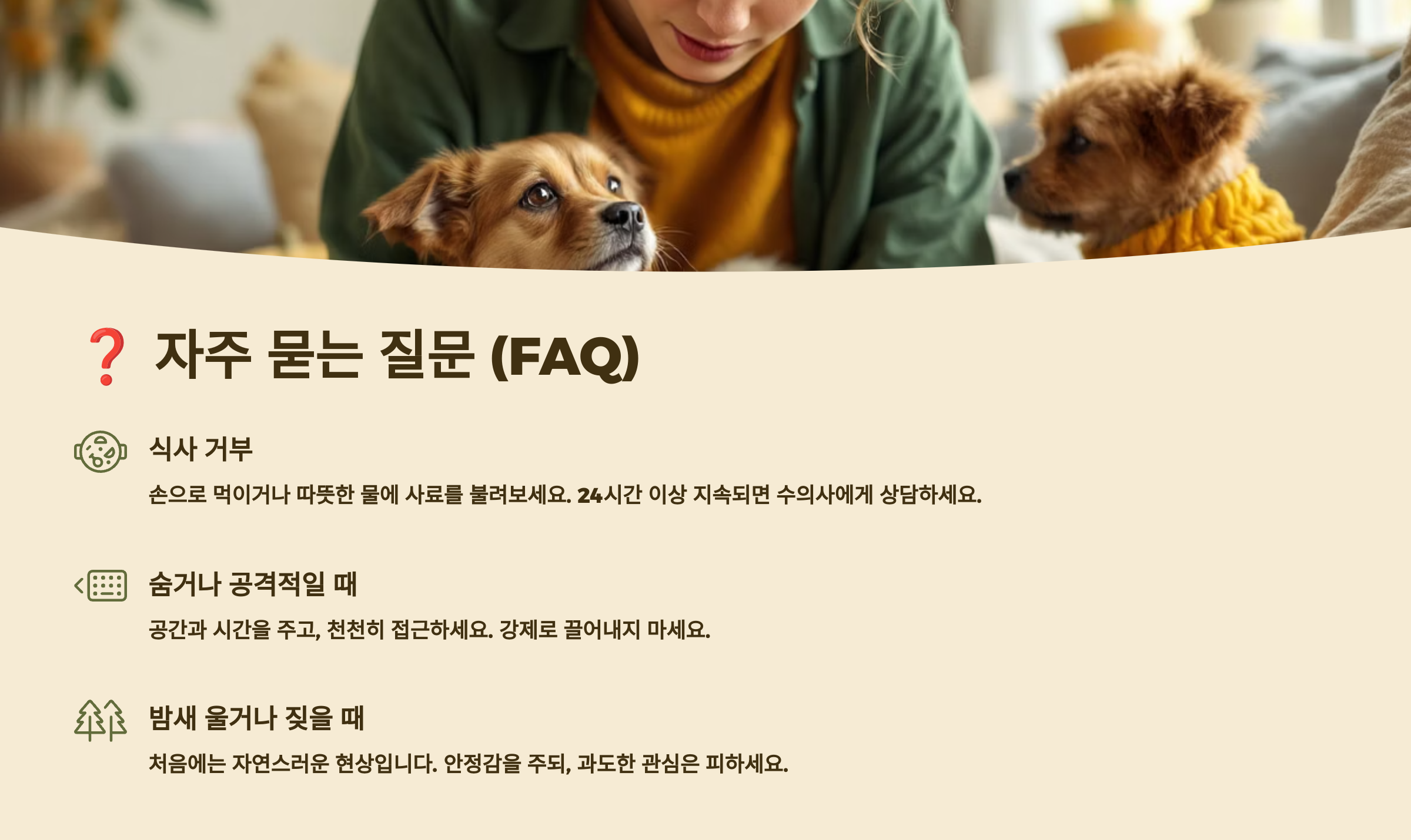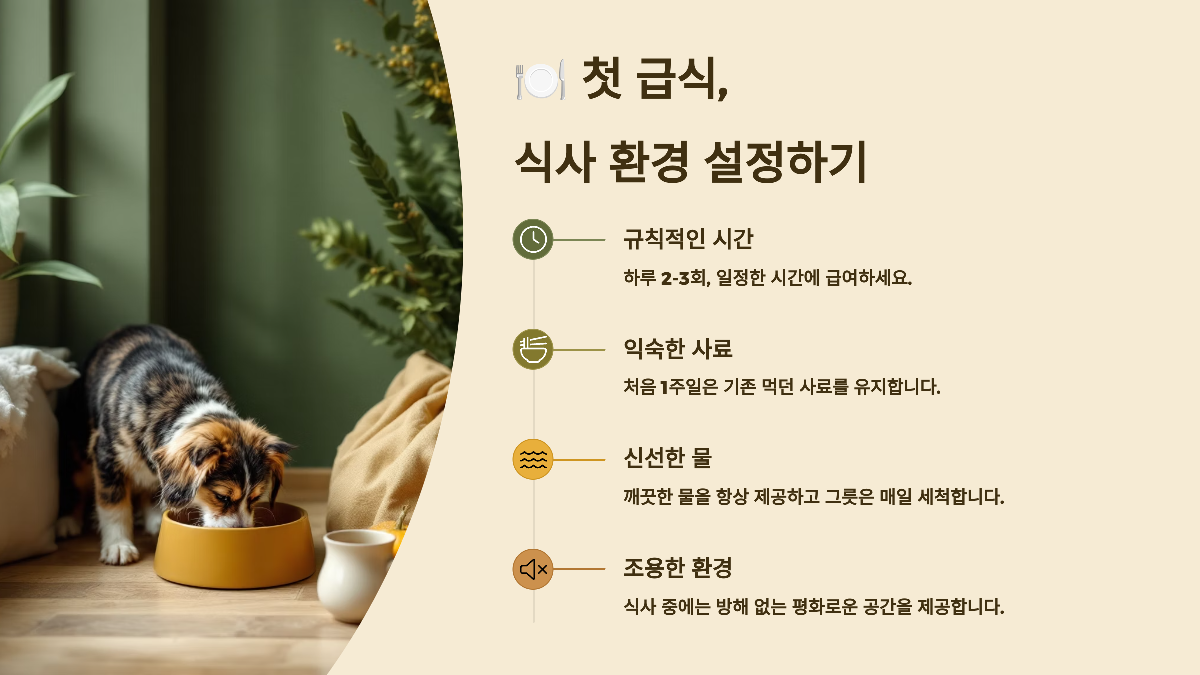 📌 첫 식사는 ‘영양’보다 ‘경험’이에요. 강요 없는 급식이 신뢰의 시작이라는 걸 기억해 주세요. 아이가 배부르고 편안해지면, 마음도 조금씩 열릴 거예요. 🥣🐾