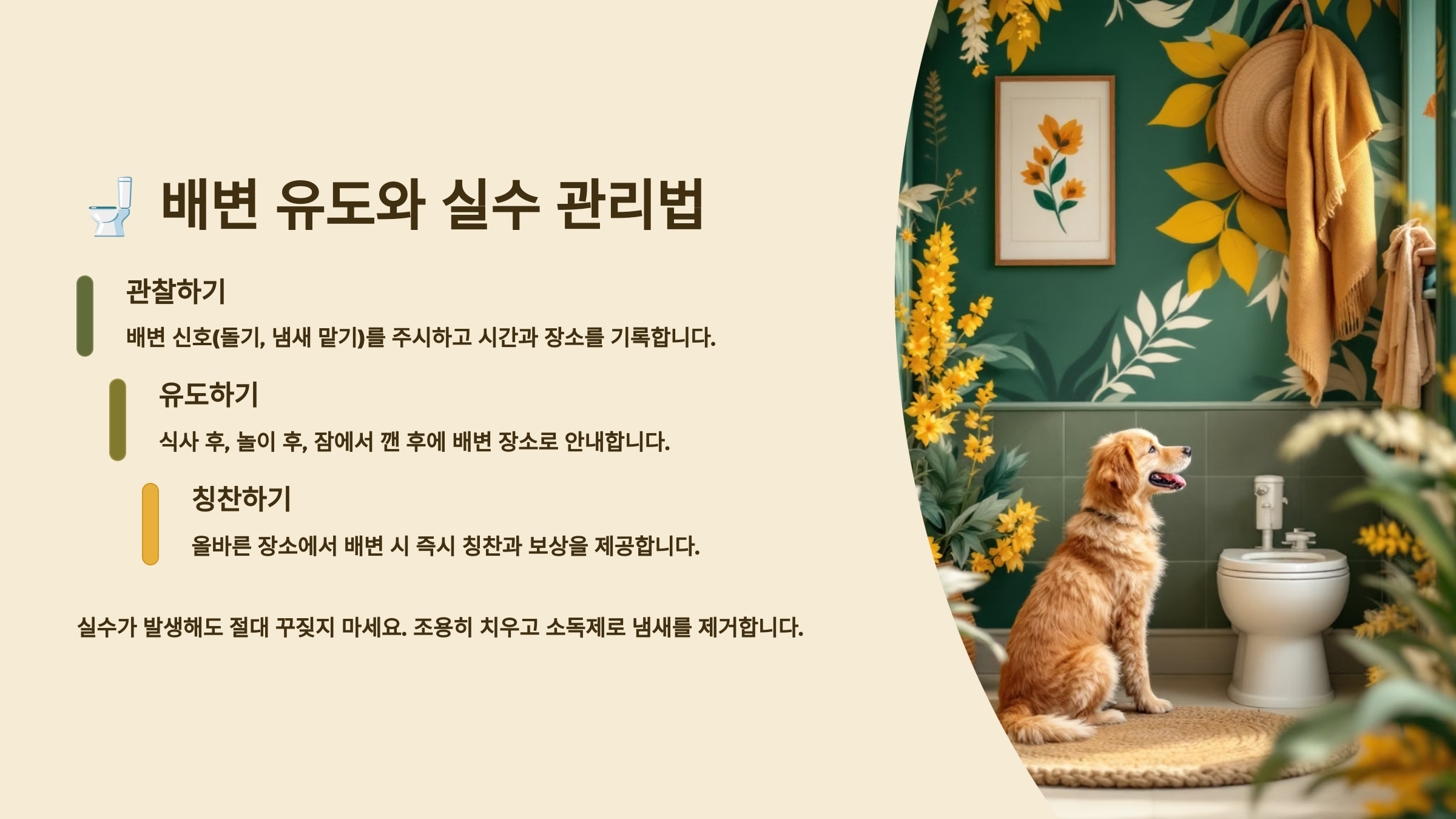 📌 아래 표는 배변 유도를 돕기 위한 환경 조건과 실수 시 대처법을 정리했어요. 아이의 실수는 적응 과정일 뿐, 실패가 아니에요! 😊