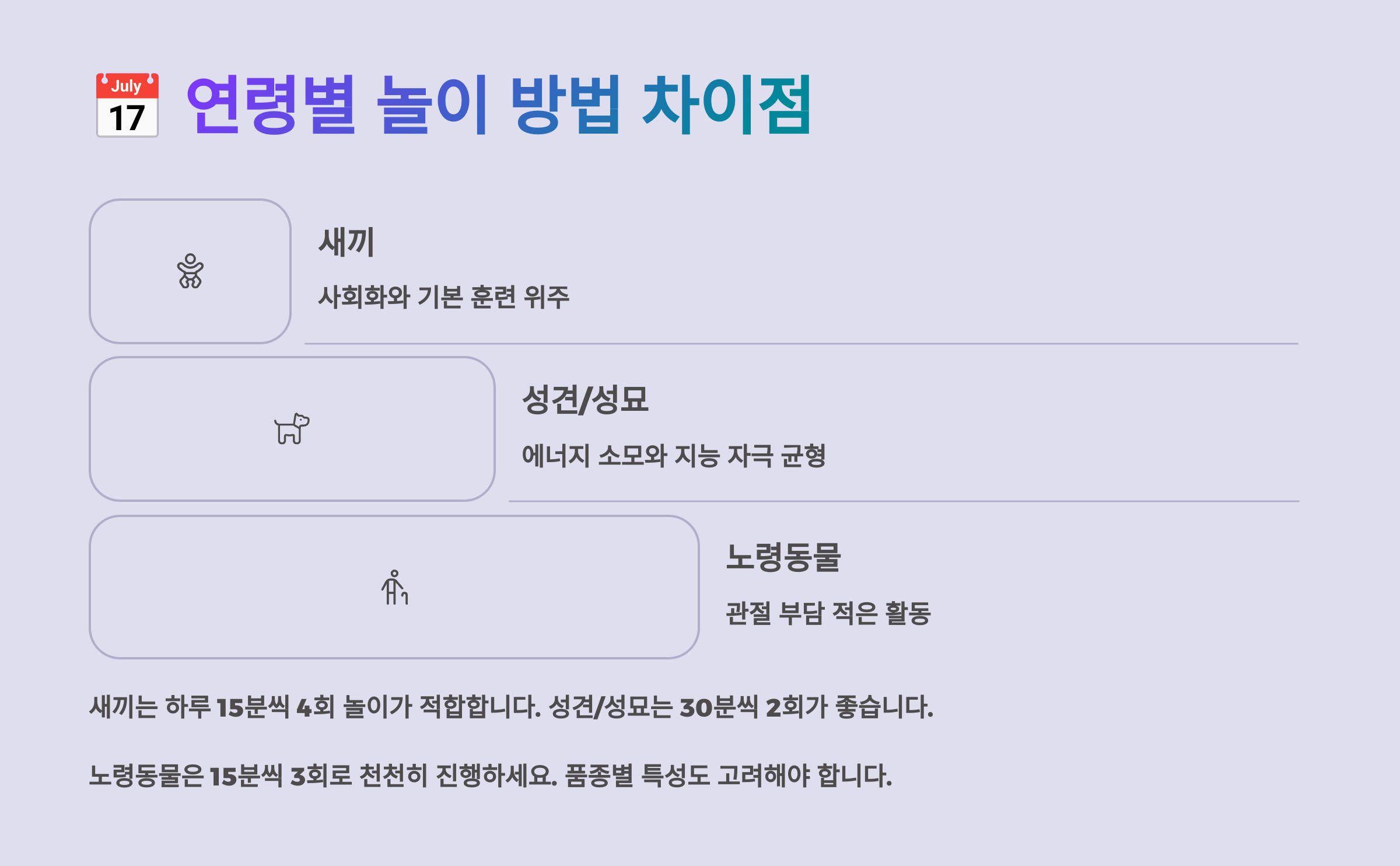 연령대별로도 놀이의 효과가 다르게 나타나요. 어린 반려동물들에게는 사회화와 학습에 도움이 되고, 성견/성묘에게는 스트레스 해소와 건강 유지에 중요하며, 노령 반려동물에게는 인지 기능 유지와 관절 건강에 도움이 되어요. 따라서 반려동물의 생애 전반에 걸쳐 지속적으로 적절한 놀이를 제공하는 것이 중요해요. 놀이는 단순한 시간 보내기가 아니라 반려동물의 삶의 질을 향상시키는 필수적인 활동이라는 것을 꼭 기억해주세요! 🎯