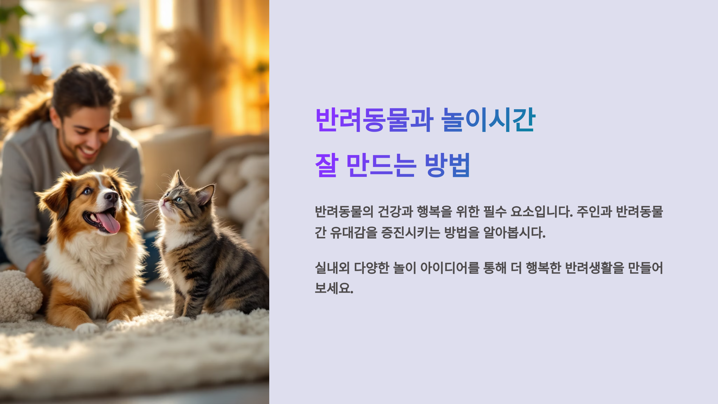 하지만 많은 보호자들이 어떻게 효과적이고 재미있는 놀이시간을 만들어야 할지 고민하고 있어요. 반려동물의 종류, 성격, 나이에 따라 적합한 놀이 방법이 다르고, 실내와 야외 환경에서의 놀이도 각각 다른 접근이 필요하거든요. 이 가이드를 통해 우리 반려동물에게 가장 적합한 놀이 방법을 찾아보고, 행복하고 건강한 놀이시간을 만들어보세요!