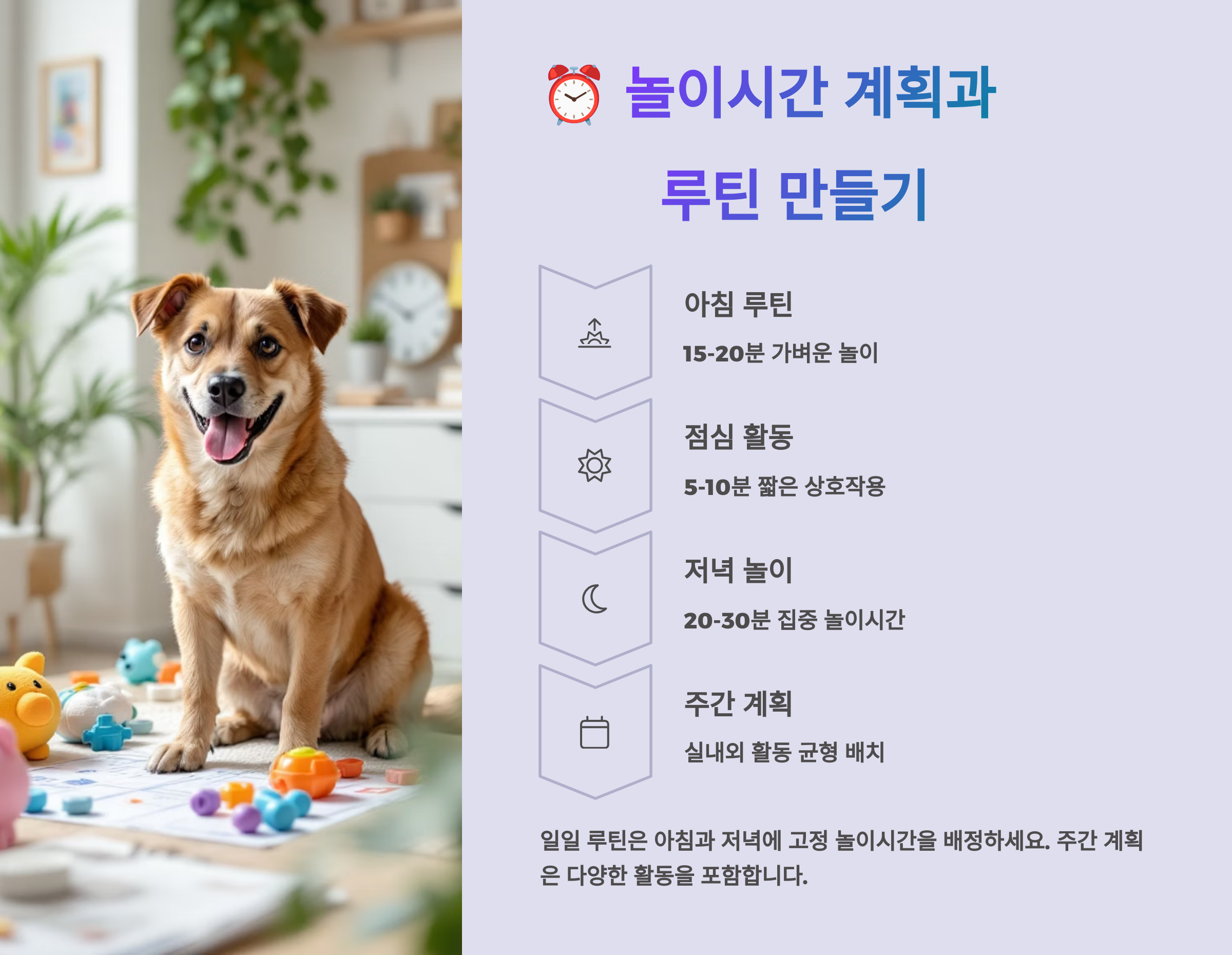 일일 놀이 스케줄을 만들 때는 다양성과 균형을 고려해야 해요. 매일 같은 놀이만 반복하면 반려동물이 지루해할 수 있으니, 요일별로 다른 활동을 계획하는 것이 좋아요. 예를 들어 월요일은 실내 퍼즐 게임, 화요일은 야외 산책, 수요일은 터그 놀이 등으로 구성할 수 있어요. 또한 신체 활동과 정신적 자극을 적절히 조합해서 반려동물의 모든 욕구를 충족시켜야 해요. 특히 바쁜 평일에는 짧지만 집중적인 놀이를, 여유로운 주말에는 더 길고 다양한 활동을 계획하면 현실적으로 지속하기 쉬워요.