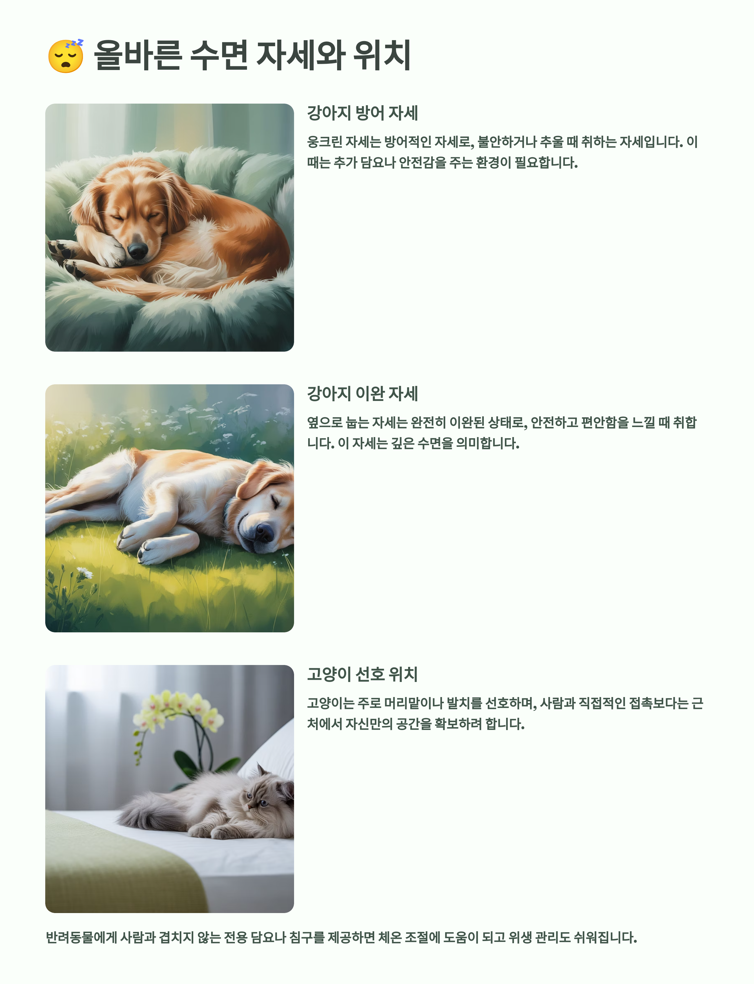 수면 중 자세 변화도 관찰해보세요. 반려동물이 자주 자세를 바꾸거나 불편해 보인다면 통증이나 불편함이 있을 수 있어요. 특히 관절염이 있는 노령 동물은 부드러운 매트리스나 정형외과용 침대가 도움이 될 수 있어요. 반려동물의 편안한 수면을 위해 다양한 자세와 위치를 시도해보고, 가장 편안해하는 방법을 찾아주세요! 😴