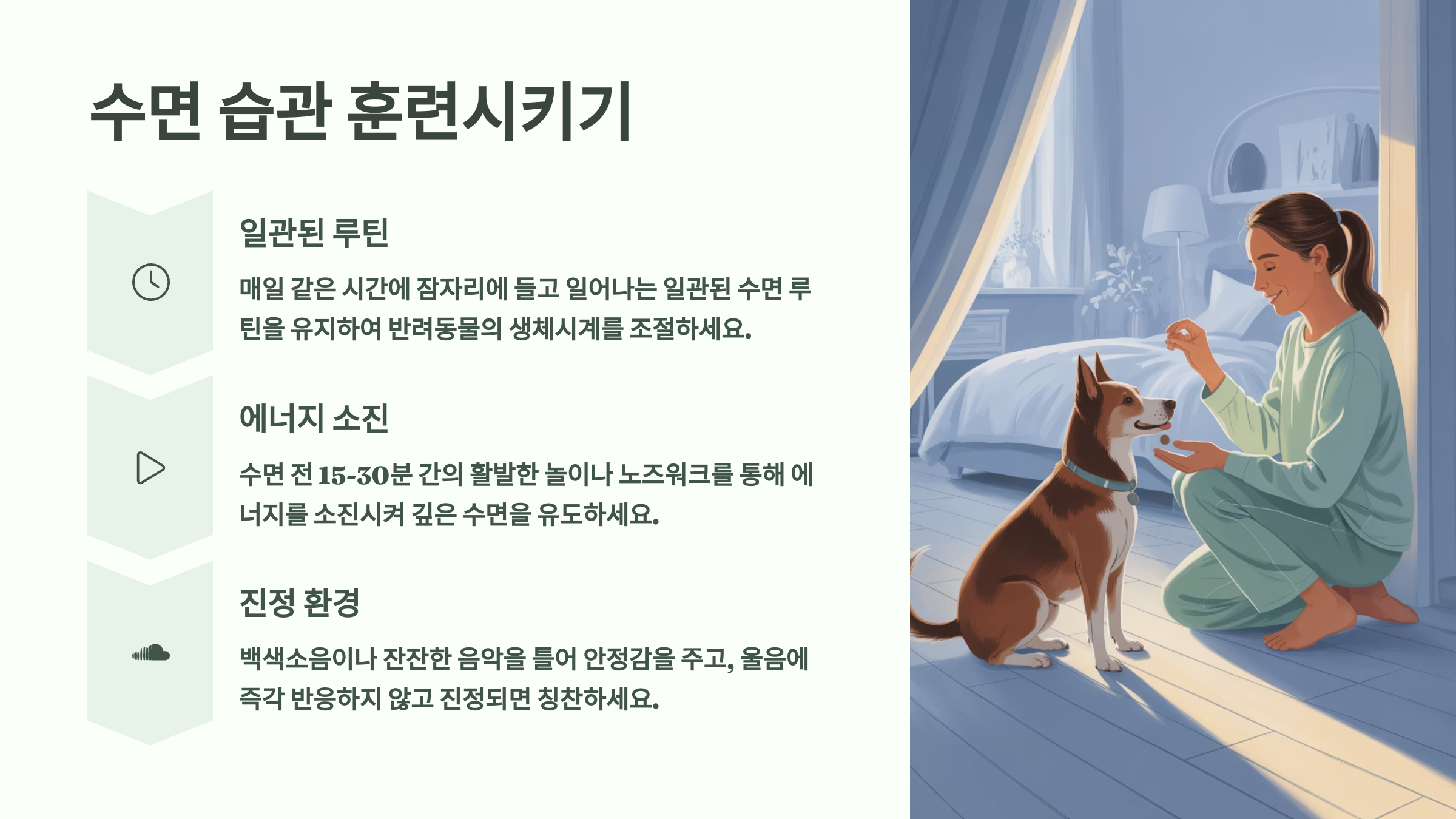 반려동물과 편안한 수면을 위해서는 올바른 수면 습관을 훈련시키는 것이 중요해요. 가장 먼저 해야 할 일은 일정한 수면 시간을 정하는 거예요. 매일 같은 시간에 잠자리에 들고 일어나면 반려동물도 자연스럽게 그 리듬에 맞춰져요. 처음에는 힘들 수 있지만, 2-3주 정도 꾸준히 하면 반려동물도 수면 시간을 인지하게 된답니다.