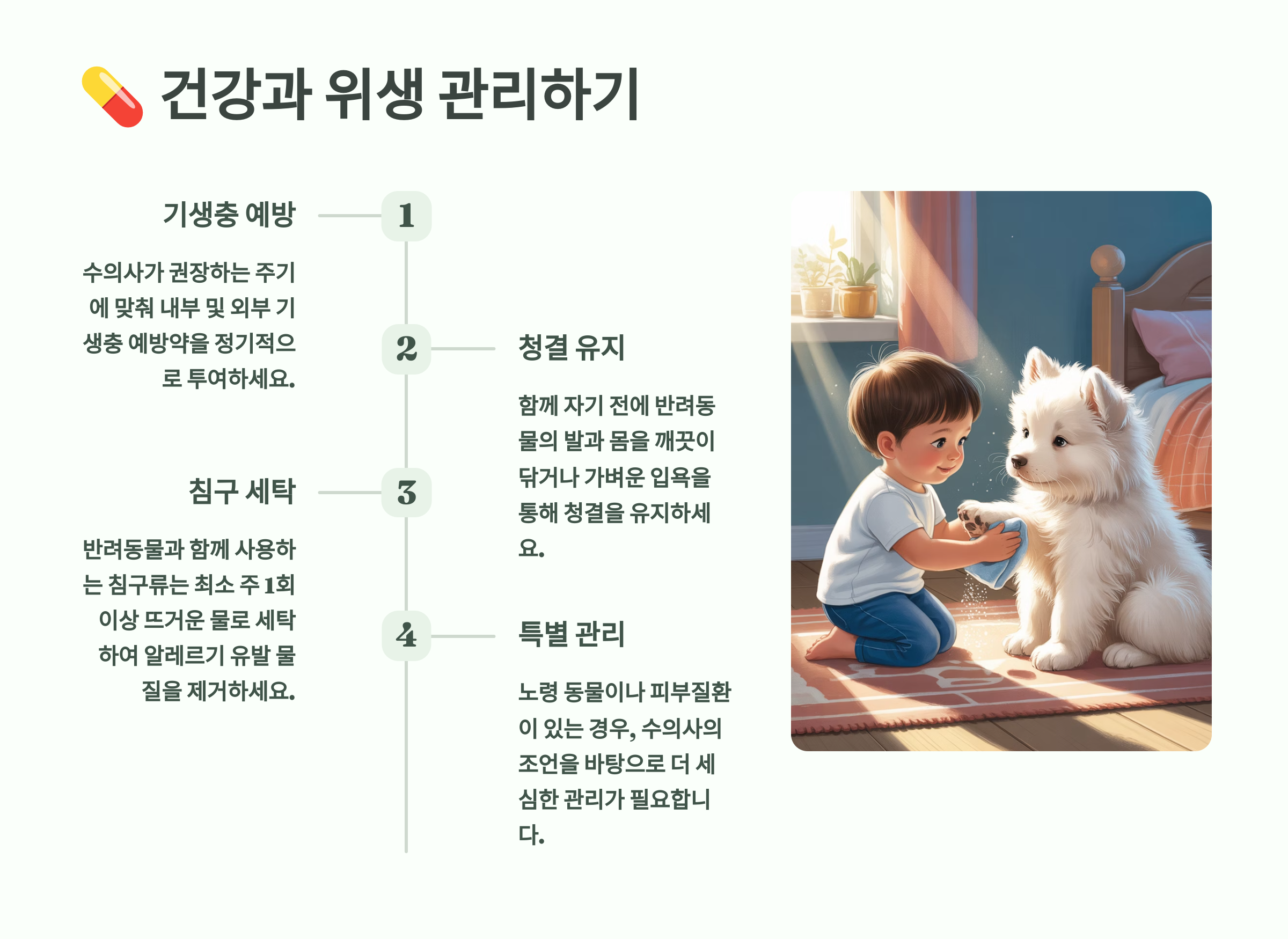 피부 관리도 함께 자는 반려동물에게는 특히 중요해요. 정기적인 브러싱으로 죽은 털을 제거하고, 피부 상태를 확인하세요. 습진, 탈모, 가려움증이 있다면 즉시 치료받아야 해요. 피부병은 사람에게 옮을 수 있고, 침구를 통해 재감염될 수 있거든요. 약용 샴푸를 사용하거나 피부 영양제를 급여하는 것도 도움이 돼요.