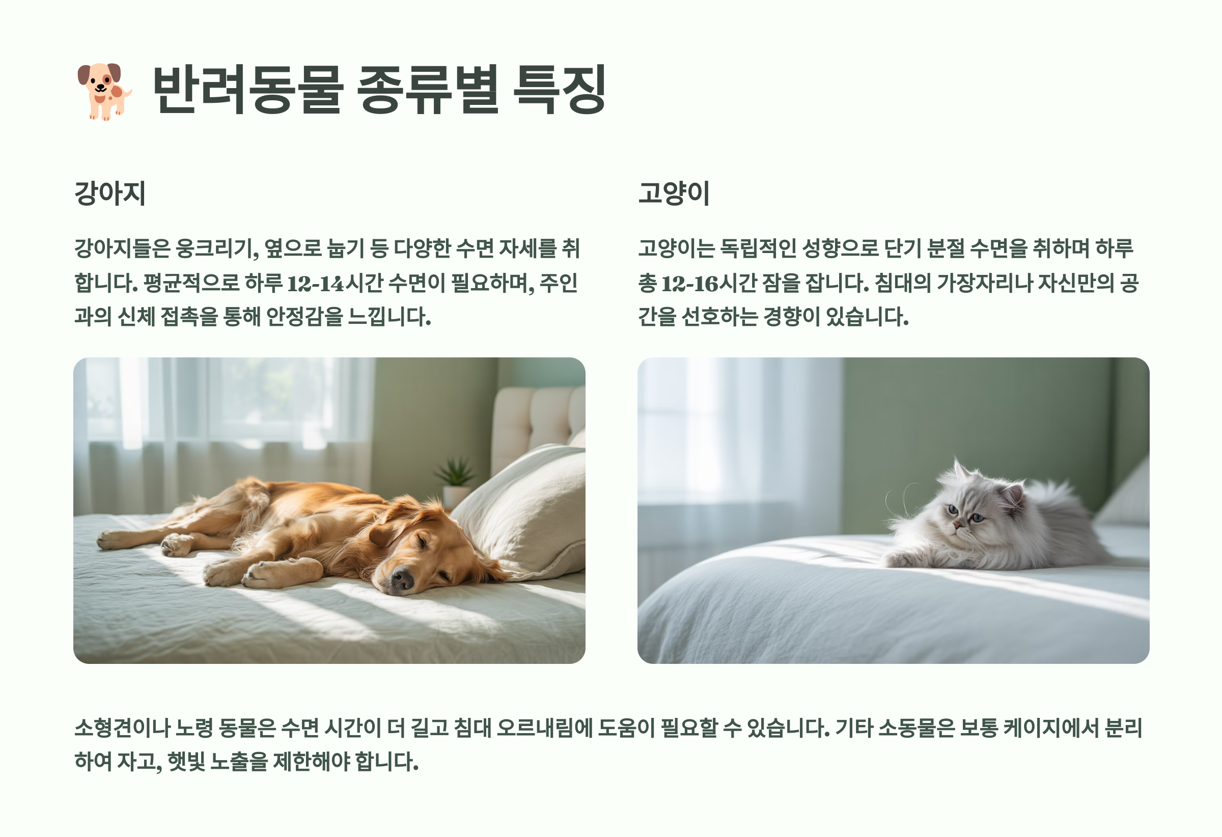 어떤 종류의 반려동물이든 개체별 성격 차이가 있다는 것을 기억해야 해요. 같은 품종이라도 어떤 아이는 조용히 자고, 어떤 아이는 밤새 돌아다닐 수 있어요. 반려동물의 성격과 습성을 잘 관찰하고, 그에 맞는 수면 환경을 만들어주는 것이 중요해요. 무엇보다 반려동물이 스트레스받지 않고 편안하게 쉴 수 있는 환경을 만드는 것이 함께 행복한 수면의 첫걸음이랍니다! 🐕