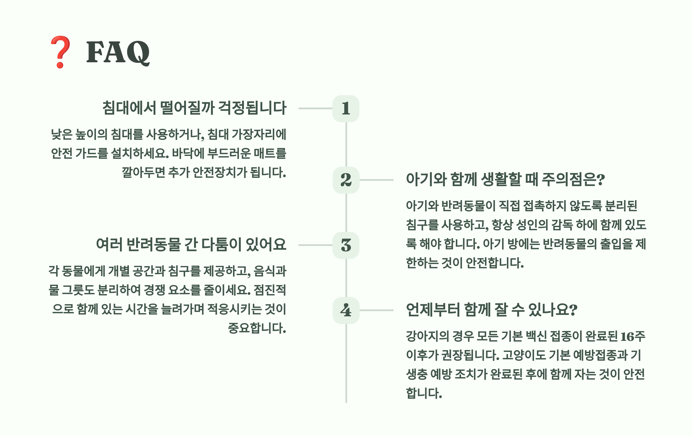 다묘/다견 가정에서는 더 세심한 관리가 필요해요. 각 개체의 성격과 서열을 고려해 침대 위치를 정해주세요. 서열이 높은 반려동물이 주인과 더 가까운 곳에 있도록 하면 갈등을 줄일 수 있어요. 또한 충분한 공간을 확보해 서로 불편하지 않도록 해야 해요. 필요하다면 킹사이즈 침대로 교체하는 것도 고려해볼 만해요.