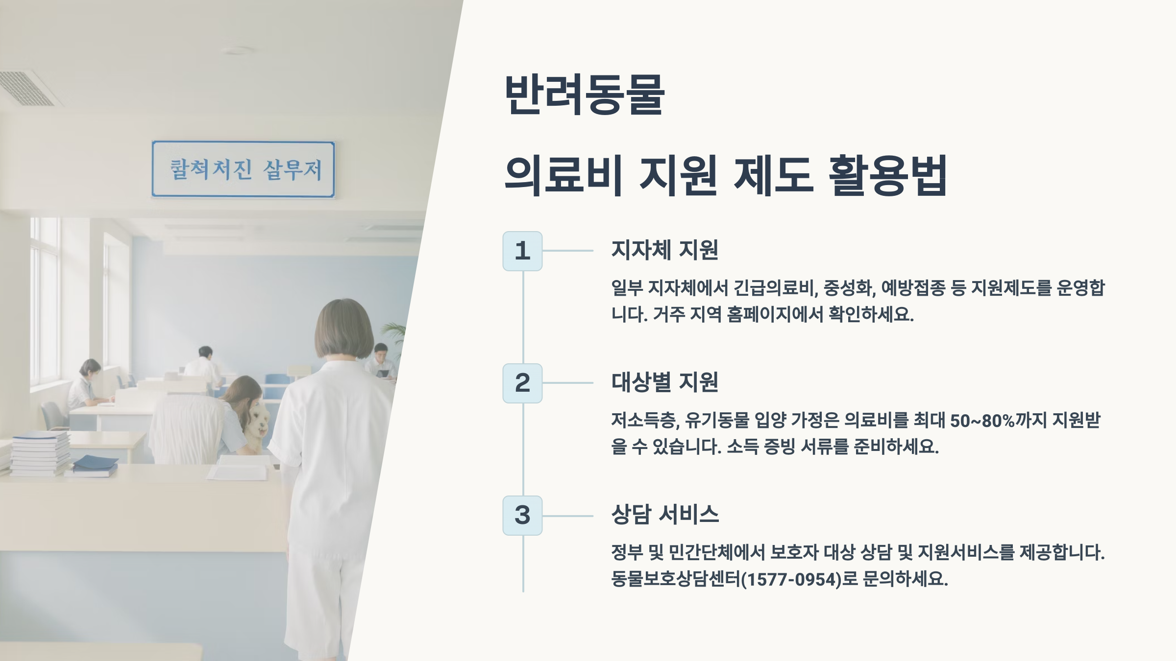 많은 사람들이 모르는 반려동물 의료비 지원 제도들이 있어요. 지자체마다 다양한 지원 사업을 운영하고 있는데, 이를 잘 활용하면 의료비를 크게 절약할 수 있어요. 서울시의 경우 '반려동물 진료비 지원 사업'을 통해 기초생활수급자와 차상위계층에게 연간 10만원까지 진료비를 지원해주고 있어요. 부산시는 '유기동물 입양 지원금'으로 입양 시 중성화 수술비와 예방접종비를 지원해주고 있답니다.