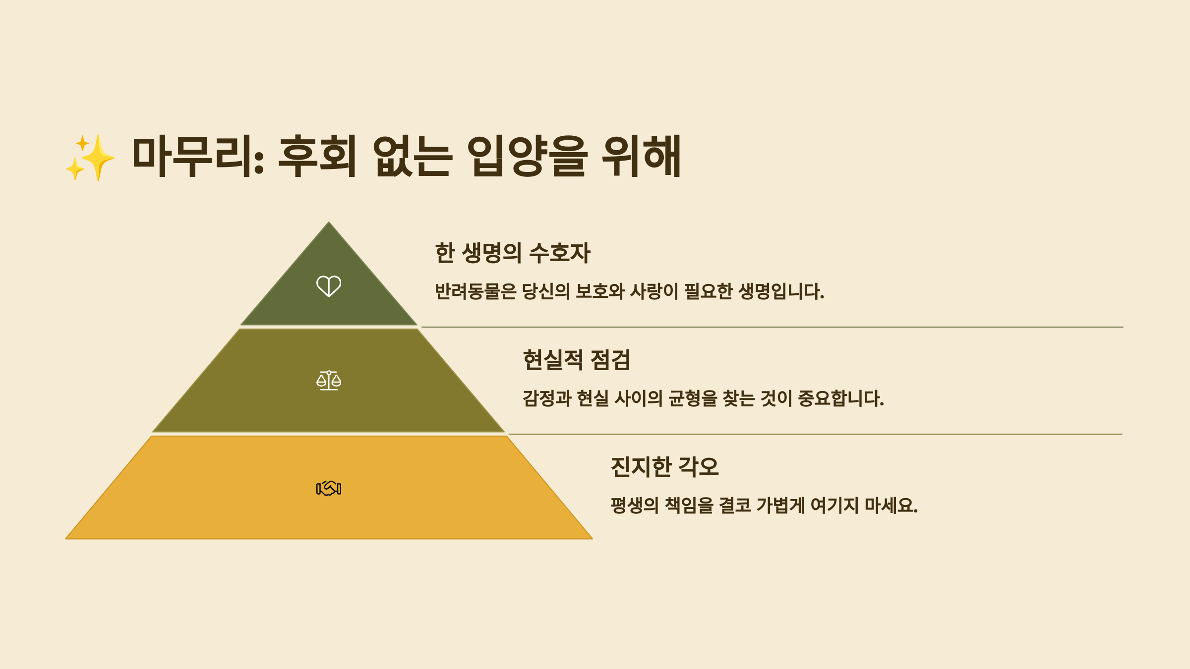 반려동물과 함께하는 삶은 분명히 큰 기쁨과 행복을 가져다줘요. 하지만 동시에 많은 책임과 희생이 따르는 일이기도 해요. 매일 산책을 시켜야 하고, 아플 때 병원에 데려가야 하며, 여행갈 때도 신경써야 하고, 경제적 부담도 감수해야 해요. 이런 현실적인 부분들을 모두 고려해서 준비된 마음으로 입양을 결정해야 나중에 후회하지 않을 수 있어요.