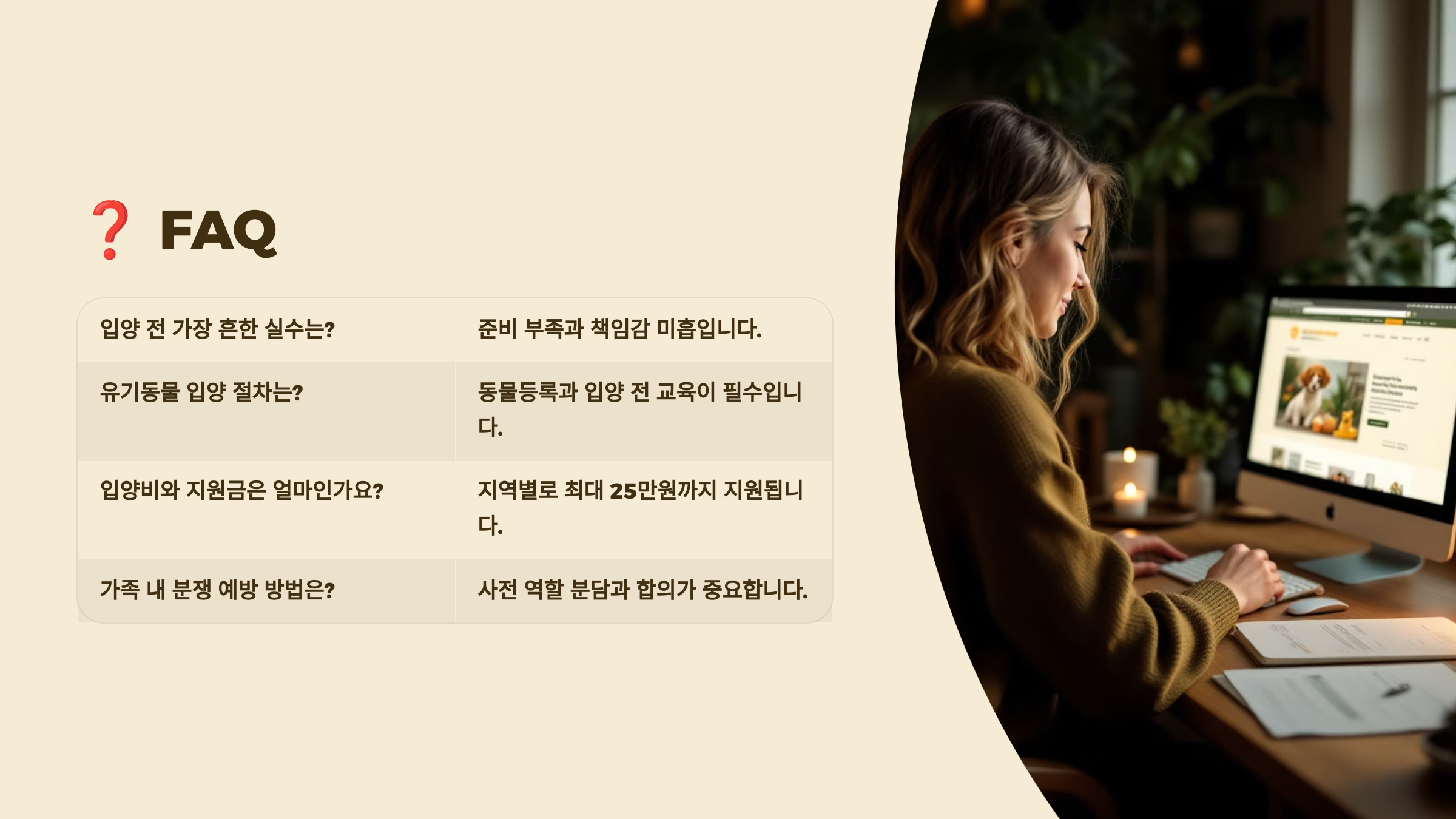경제적 준비는 반려동물과 행복하게 살기 위한 기본 조건이에요. 충분한 여유를 가지고 입양을 결정하는 것이 모두에게 좋아요! 💰