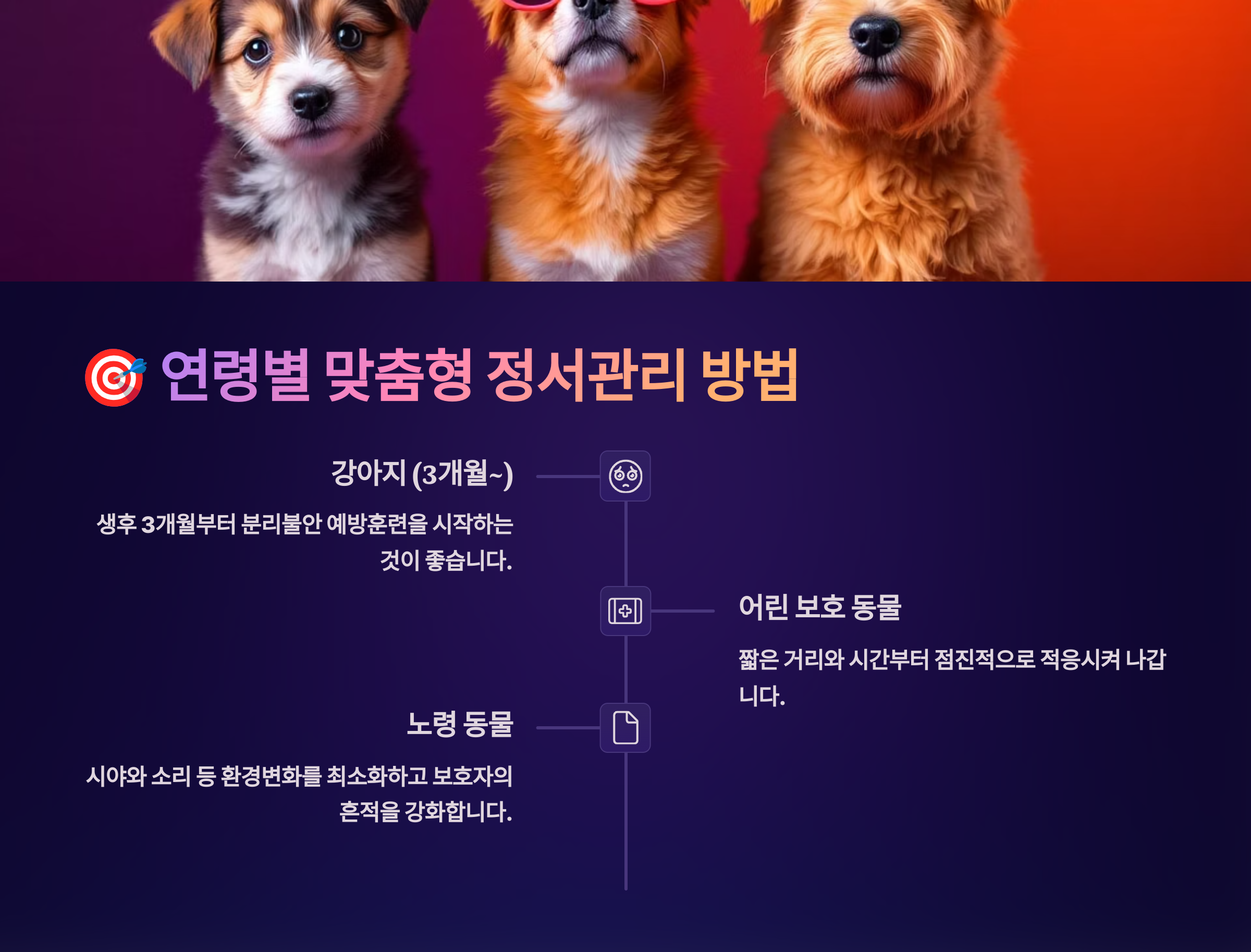 구조나 입양 초기의 반려동물은 연령과 관계없이 특별한 접근이 필요해요. 새로운 환경에 적응하는 스트레스와 과거의 트라우마가 겹쳐져서 분리불안이 더 심할 수 있어요. 이런 경우에는 충분한 적응 기간을 두고, 점진적으로 혼자 있는 시간을 늘려가야 해요. 처음에는 5-10분부터 시작해서 반려동물이 편안해하는 것을 확인한 후 조금씩 시간을 늘려가세요.