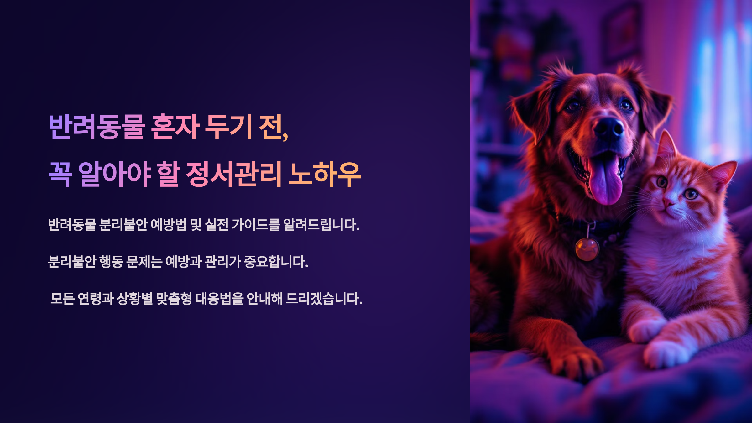 반려동물을 혼자 두고 외출하는 것은 모든 반려인들이 경험하는 일상적인 상황이에요. 하지만 우리가 생각하는 것보다 반려동물들에게는 훨씬 큰 스트레스가 될 수 있답니다. 특히 개나 고양이는 사회적 동물이기 때문에 혼자 있는 시간을 힘들어할 수 있어요. 분리불안으로 인한 문제행동, 스트레스성 질병, 우울증 등이 발생할 수 있어서 사전에 충분한 준비와 관리가 필요해요.