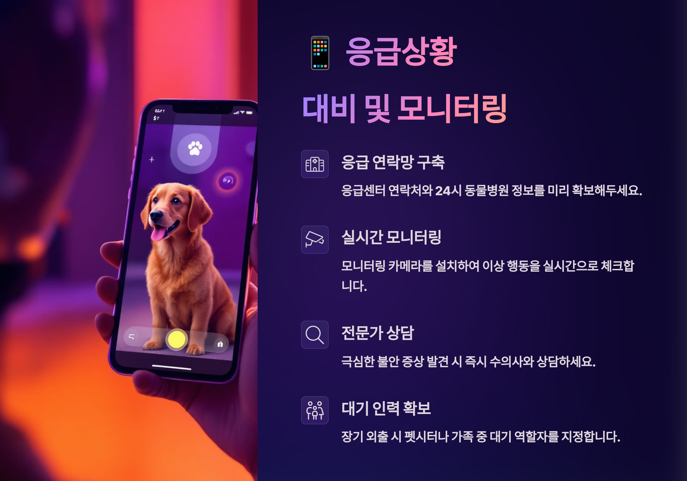 응급상황 대비책도 반드시 마련해두세요. 가까운 동물병원 연락처를 잘 보이는 곳에 붙여두고, 응급처치용품도 준비해두시는 것이 좋아요. 또한 이웃이나 친구, 펫시터에게 비상연락처를 알려두고 응급상황 시 도움을 요청할 수 있도록 미리 부탁해두세요. 만약 장시간 외출이 필요하다면 중간에 한 번 확인할 수 있는 사람을 섭외해두는 것도 좋은 방법이에요.