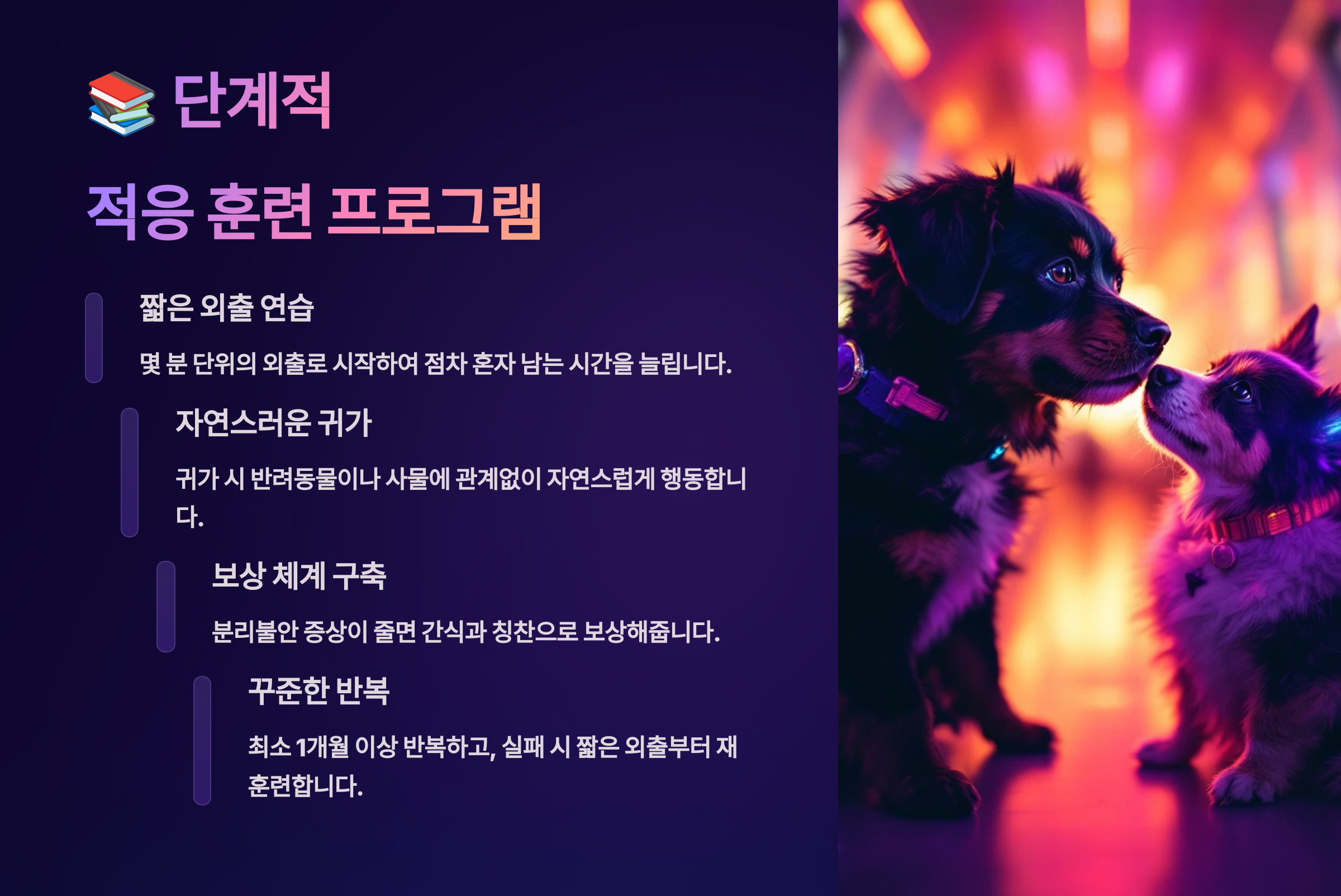 분리불안 완화 훈련의 기본 원리는 점진적 둔감화예요. 갑자기 오랜 시간 혼자 두는 것이 아니라, 아주 짧은 시간부터 시작해서 조금씩 늘려가는 거예요. 처음에는 5분부터 시작해서 반려동물이 편안해하는 것을 확인한 후 10분, 15분, 30분 순으로 점차 늘려가세요. 이때 중요한 것은 반려동물이 불안해하지 않는 선에서 시간을 늘려야 한다는 거예요. 만약 불안 증상을 보인다면 다시 짧은 시간으로 돌아가서 천천히 적응시켜야 해요.