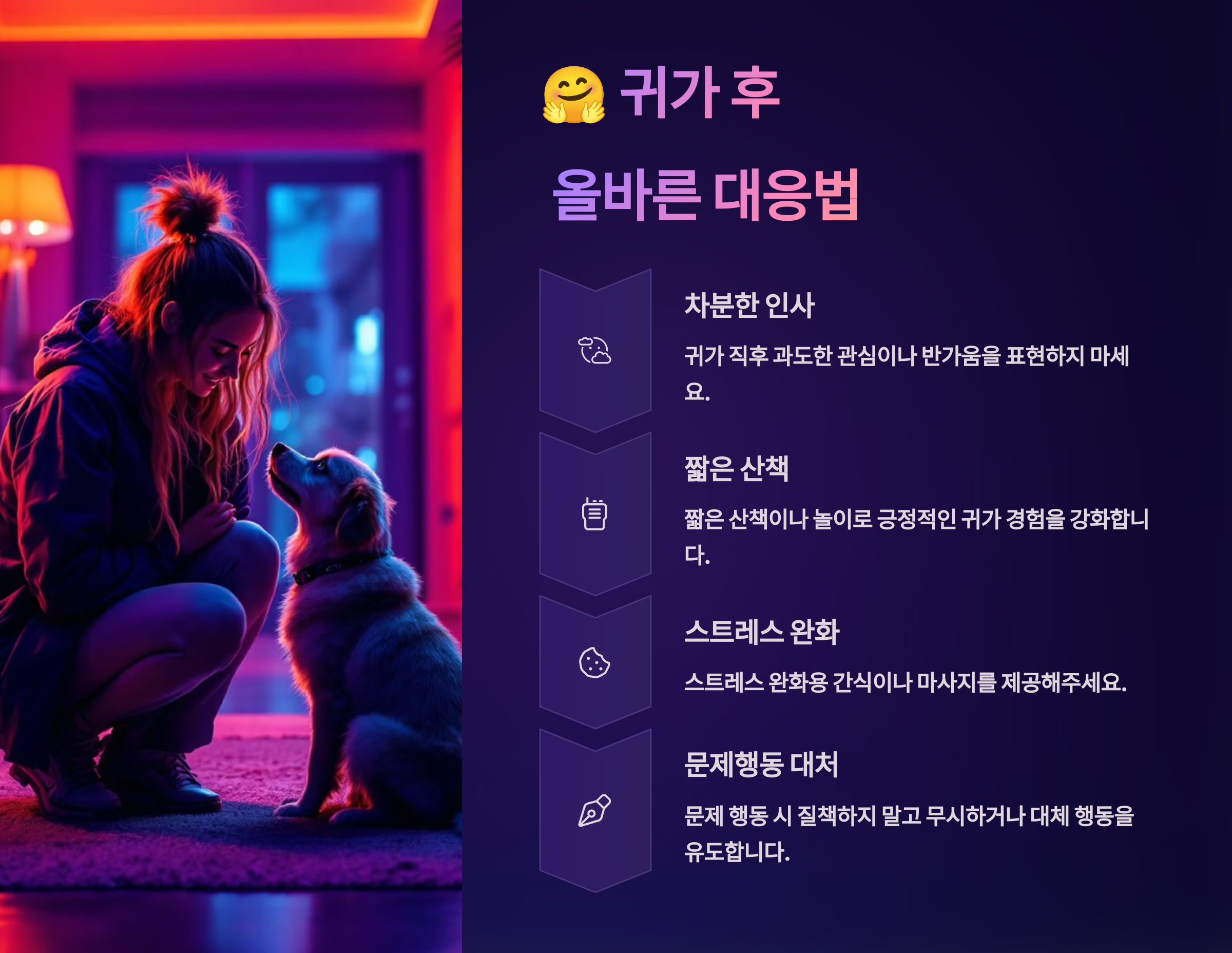 귀가 시의 올바른 반응은 분리불안 관리에서 매우 중요한 부분이에요. 많은 보호자들이 죄책감으로 인해 귀가하자마자 과도하게 반려동물에게 관심을 주는데, 이는 오히려 분리불안을 악화시킬 수 있어요. 가장 좋은 방법은 평상시와 같은 차분한 태도를 유지하는 거예요. 집에 들어와서는 먼저 짐을 정리하고 옷을 갈아입는 등의 일상적인 활동을 한 후에 반려동물과 인사하세요. 이렇게 하면 귀가가 특별한 사건이 아니라 일상적인 일로 받아들이게 돼요.