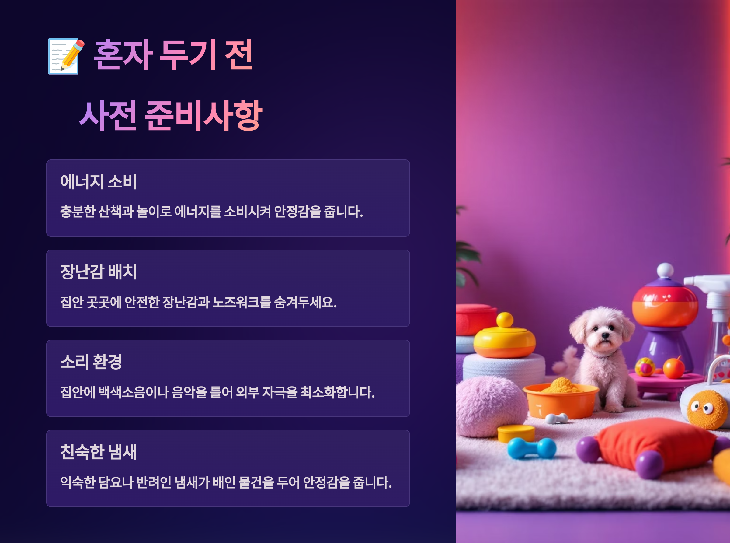 정신적 자극을 위한 준비도 필요해요. 지루함은 스트레스를 증가시키고 문제행동을 유발할 수 있어요. 퍼즐 장난감, 간식이 나오는 장난감, 씹을 수 있는 장난감 등을 준비해서 혼자 있는 시간을 유익하게 보낼 수 있도록 도와주세요. 다만 새로운 장난감은 미리 소개해서 익숙해지도록 하고, 안전성도 확인해야 해요.