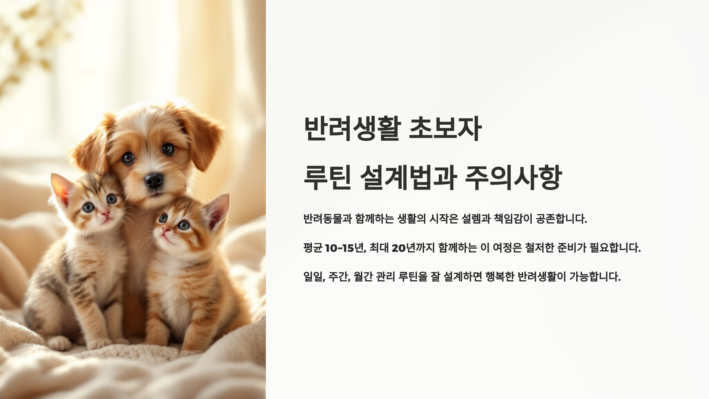 반려동물과의 생활을 시작하는 것은 인생에서 가장 특별한 경험 중 하나예요. 하지만 초보자에게는 어디서부터 시작해야 할지 막막할 수 있습니다. 올바른 루틴 설계와 체계적인 준비가 성공적인 반려생활의 핵심이에요. 단순히 귀엽다고 충동적으로 시작하면 나중에 큰 어려움을 겪을 수 있답니다.