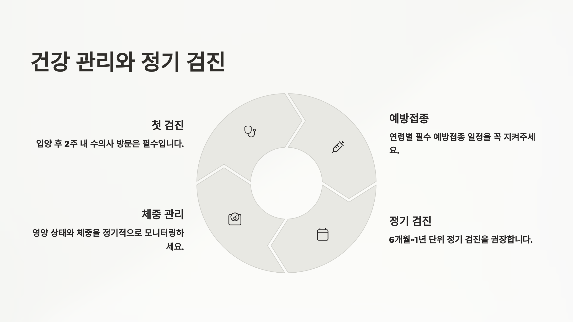 새끼 (0-1세) | 예방접종, 사회화 | 월 1회 | 전염병, 기생충 |