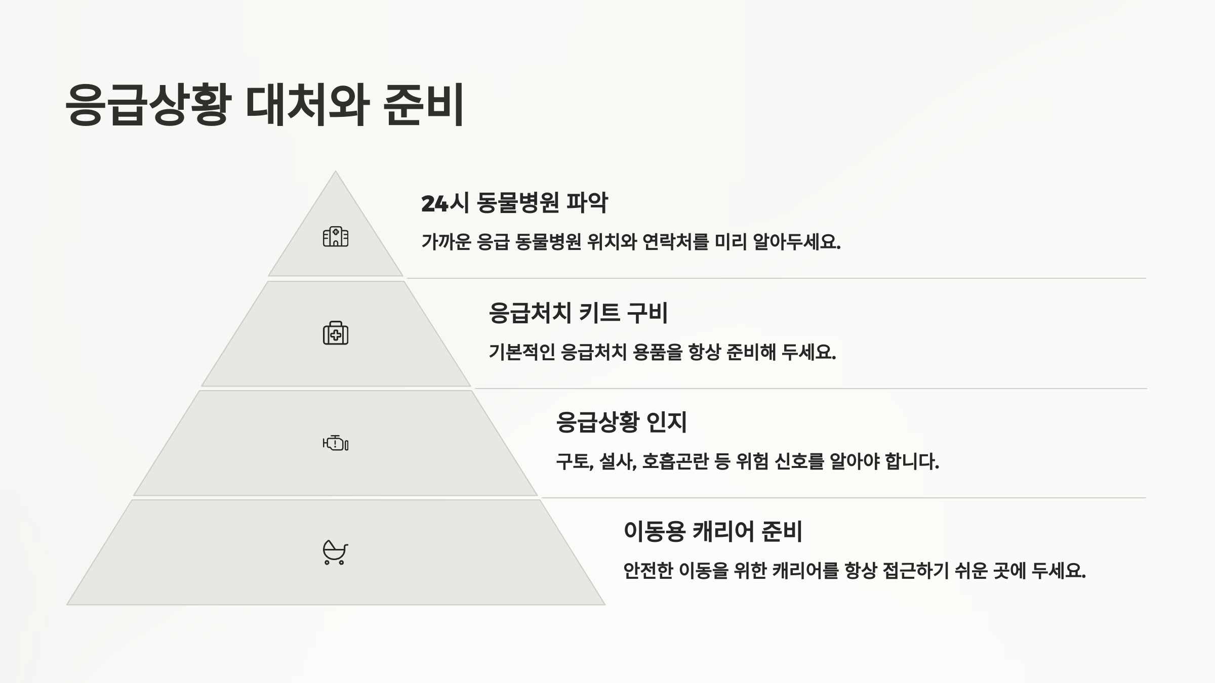 | 중독 | 구토, 설사, 경련 | 즉시 병원 연락 | 구토 유발 시도 금지 |