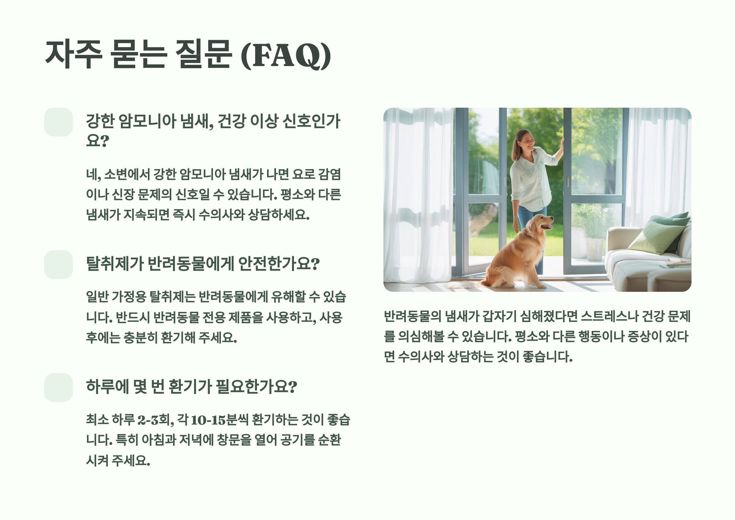A28. 냄새 자체보다는 털, 비듬, 침 등의 알레르겐이 문제예요. 공기청정기를 사용하고, 청소를 자주 하며, 침실은 반려동물 출입을 제한하는 것이 도움이 됩니다.