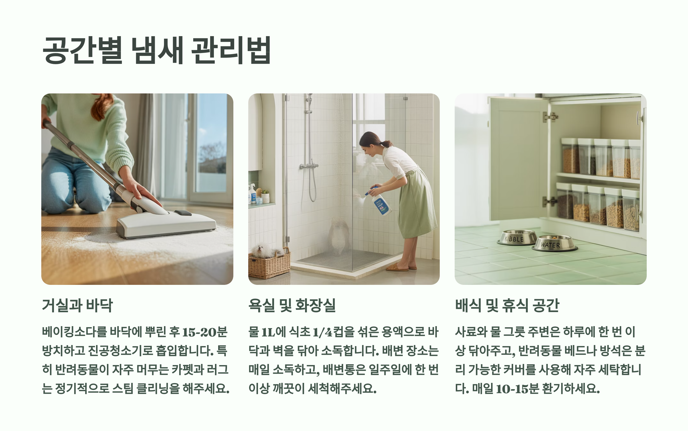 각 공간의 특성에 맞는 관리법을 실천하면 집 전체가 쾌적해질 수 있어요. 특히 반려동물이 자주 머무는 공간은 더욱 신경 써서 관리해주세요! 🏠✨