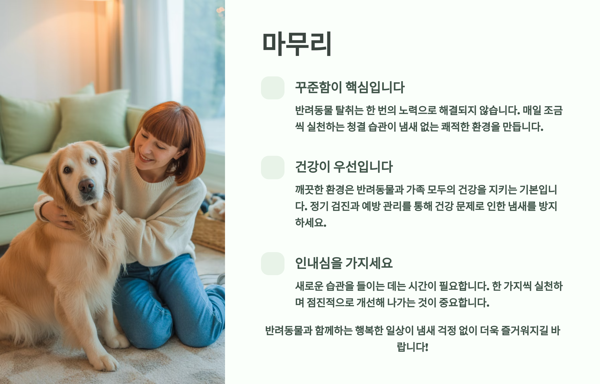 반려동물 탈취는 단순히 냄새를 없애는 것이 아니라, 우리와 반려동물이 더 건강하고 쾌적한 환경에서 생활할 수 있도록 하는 중요한 일이에요. 오늘 배운 내용을 잘 활용하셔서 더욱 행복한 반려 생활 되시길 바랍니다! 🏡✨