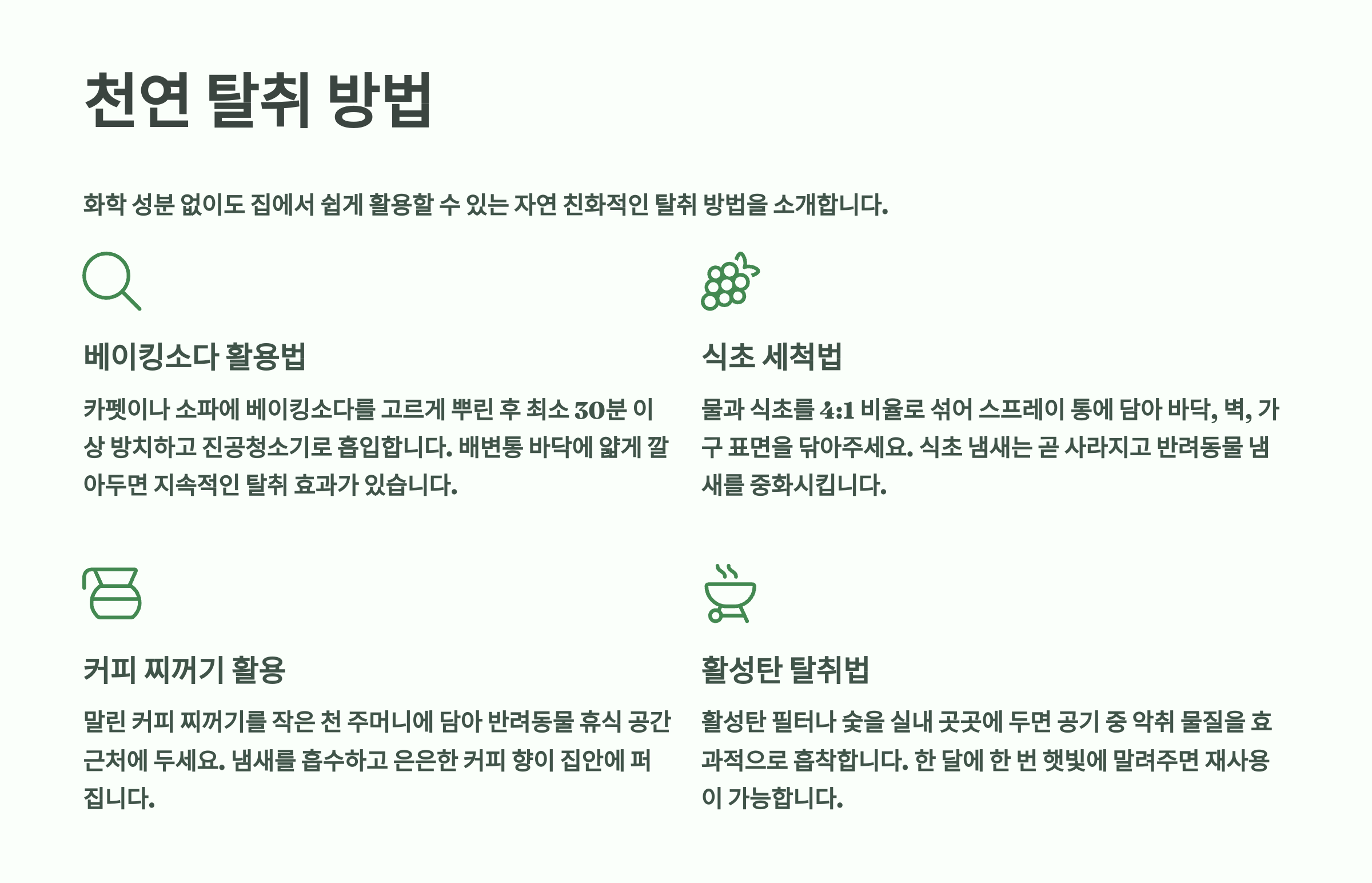 | 배설물 냄새 | 화장실, 배변 실수 | 즉시 청소, 탈취제 사용 |