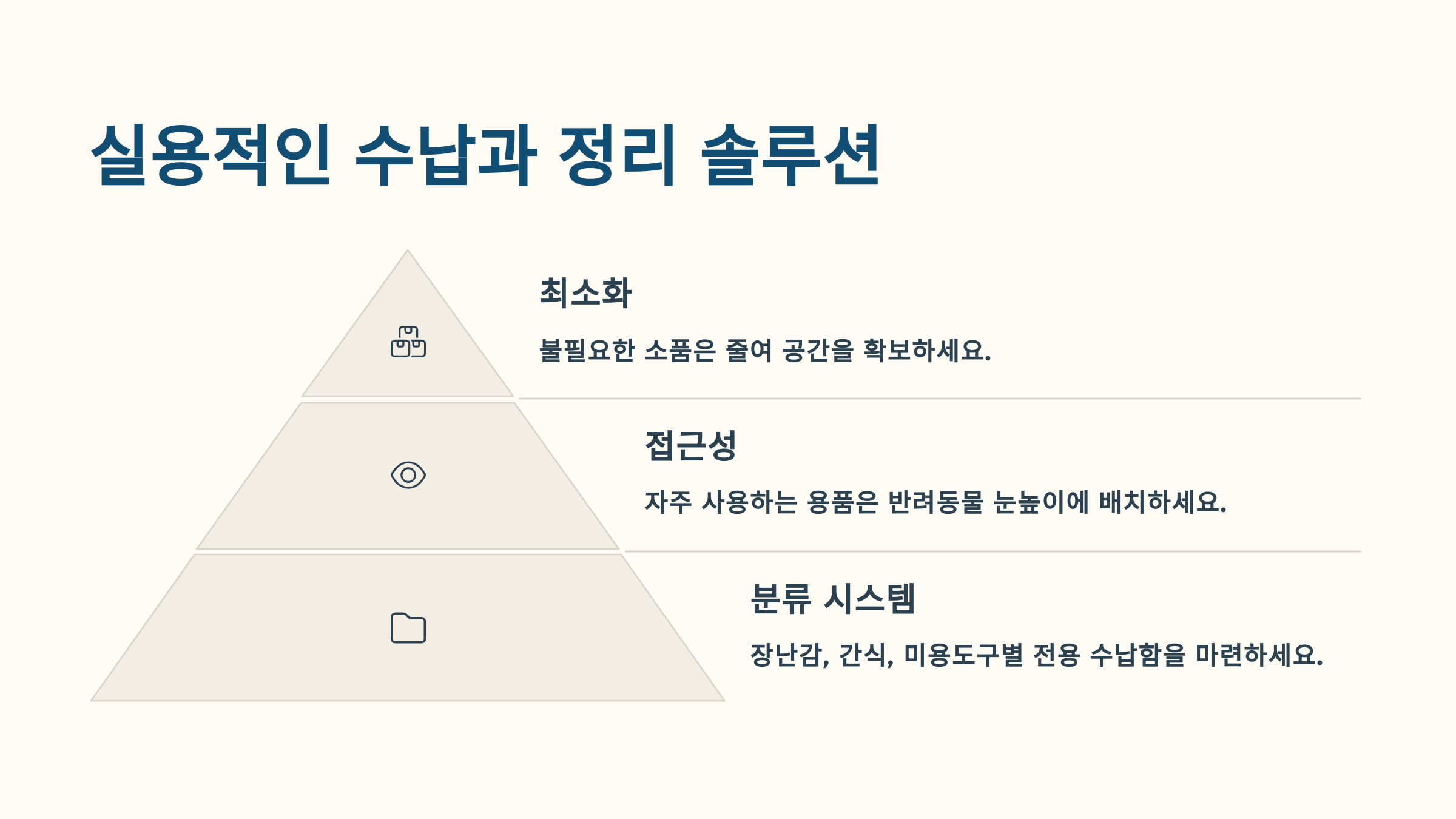 반려동물과 함께 생활하다 보면 사료, 간식, 장난감, 용품 등 다양한 물건들이 빠르게 늘어나기 때문에 체계적인 수납 시스템이 필요해요. 먼저 반려동물 용품을 종류별로 분류해서 보관하는 것이 중요해요. 사료와 간식은 밀폐용기에 보관해서 신선도를 유지하고 벌레나 습기로부터 보호해야 하고, 장난감은 세척이 쉬운 바구니나 서랍에 정리하는 것이 좋아요. 의료용품이나 그루밍 도구는 별도의 키트로 만들어서 응급상황에 빠르게 찾을 수 있도록 준비해두는 것이 실용적이에요. 또한 자주 사용하는 물건은 접근하기 쉬운 곳에, 가끔 사용하는 물건은 높은 곳이나 안쪽에 보관하는 것이 효율적이랍니다.