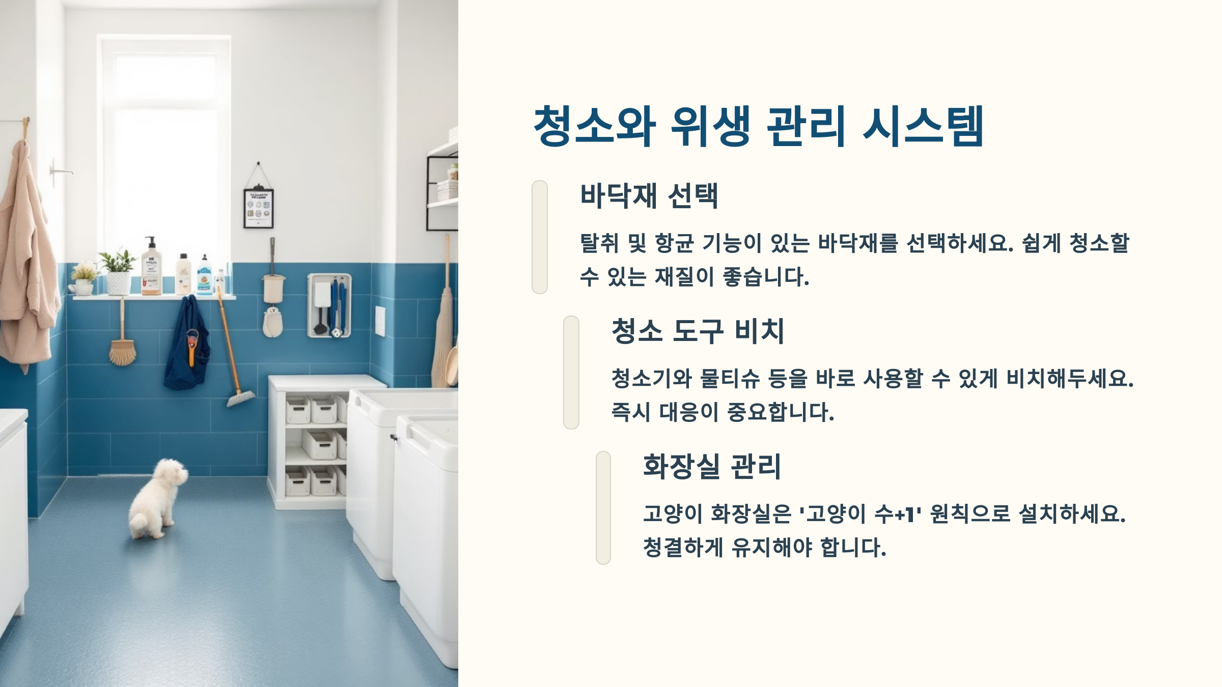 두 번째 원칙은 청소와 관리의 편의성을 고려하는 것이에요. 반려동물과 함께 생활하다 보면 털 날림, 발자국, 침구 오염 등이 불가피하게 발생해요. 따라서 쉽게 청소할 수 있는 바닥재와 세탁 가능한 패브릭, 방수 기능이 있는 소재를 선택하는 것이 좋아요. 특히 고양이를 키우는 경우 스크래칭 포스트나 캣 타워 주변은 더욱 견고하고 청소하기 쉬운 소재로 마감하는 것이 실용적이랍니다. 이런 배려가 있어야 오랫동안 깔끔하고 아름다운 공간을 유지할 수 있어요.