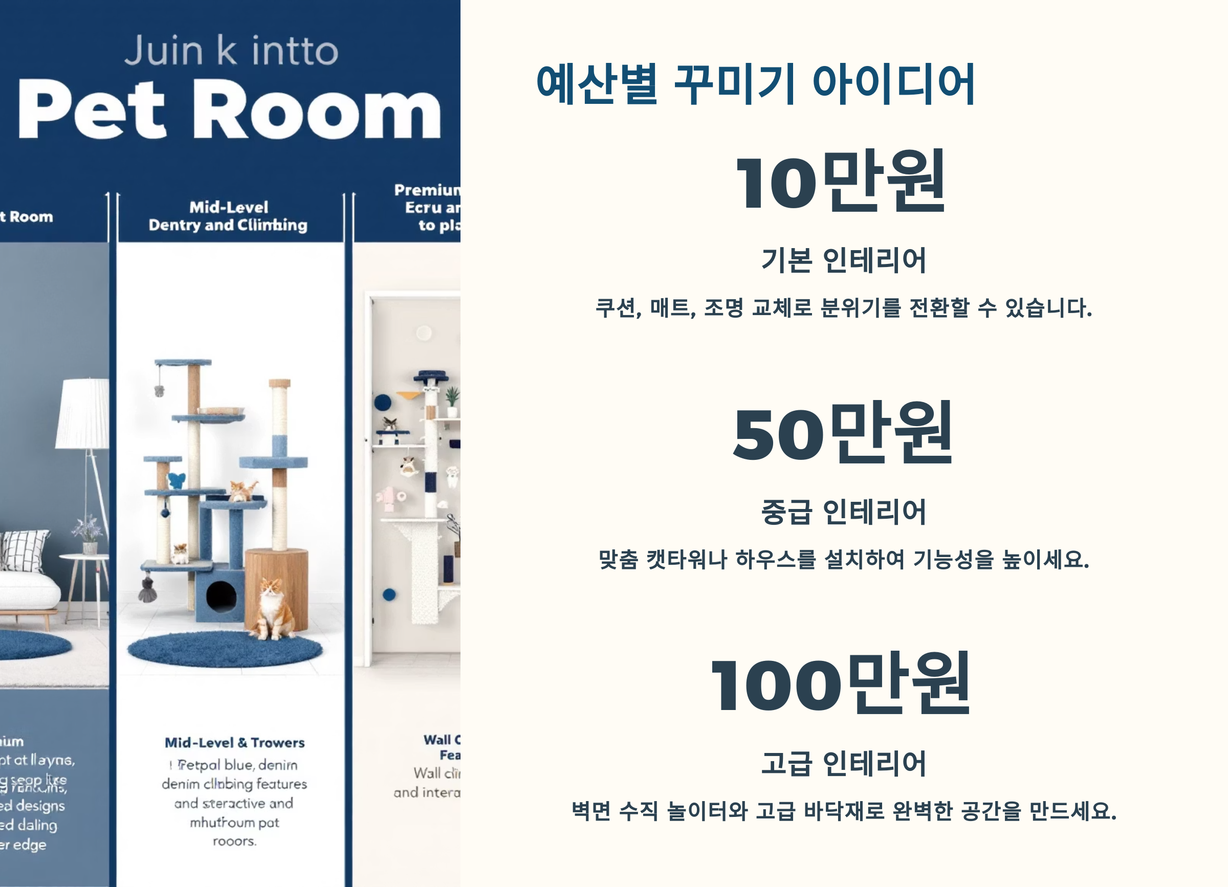 100만원 이상의 고예산이 있다면 품질과 디자인을 모두 고려한 프리미엄 인테리어가 가능해요. 이 단계에서는 맞춤 제작 가구나 고급 소재의 제품들을 선택할 수 있고, 전체적인 공간 디자인의 통일성도 고려할 수 있어요. 예를 들어, 원목으로 제작된 맞춤형 캣 타워나 디자이너 브랜드의 반려동물 침대, 스마트 급식기나 자동 화장실 등 첨단 기능이 있는 제품들을 도입할 수 있어요. 또한 전체 방의 바닥재와 벽지를 반려동물 친화적이면서도 고급스러운 소재로 교체하고, 맞춤형 수납가구나 인테리어 소품으로 완성도 높은 공간을 만들 수 있어요. 이때는 인테리어 전문가나 반려동물 공간 디자이너의 조언을 받는 것도 좋은 투자가 될 수 있답니다.