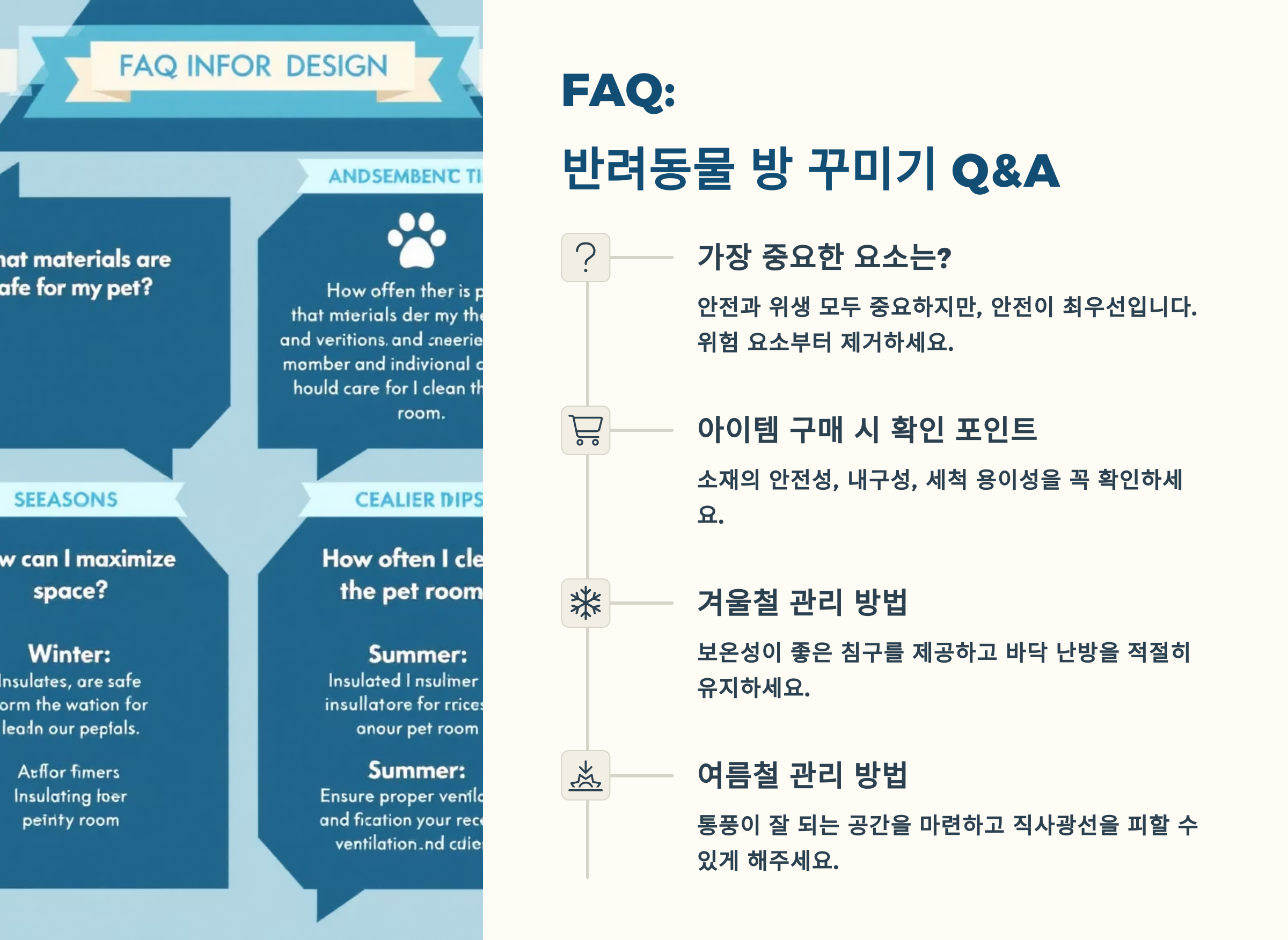 A8. 정기적인 안전 점검과 청소가 가장 중요해요. 월 1회 가구 안정성 확인, 주간 단위 깊은 청소, 반려동물의 행동 변화 관찰 등을 통해 지속적으로 안전하고 건강한 환경을 유지해야 해요.