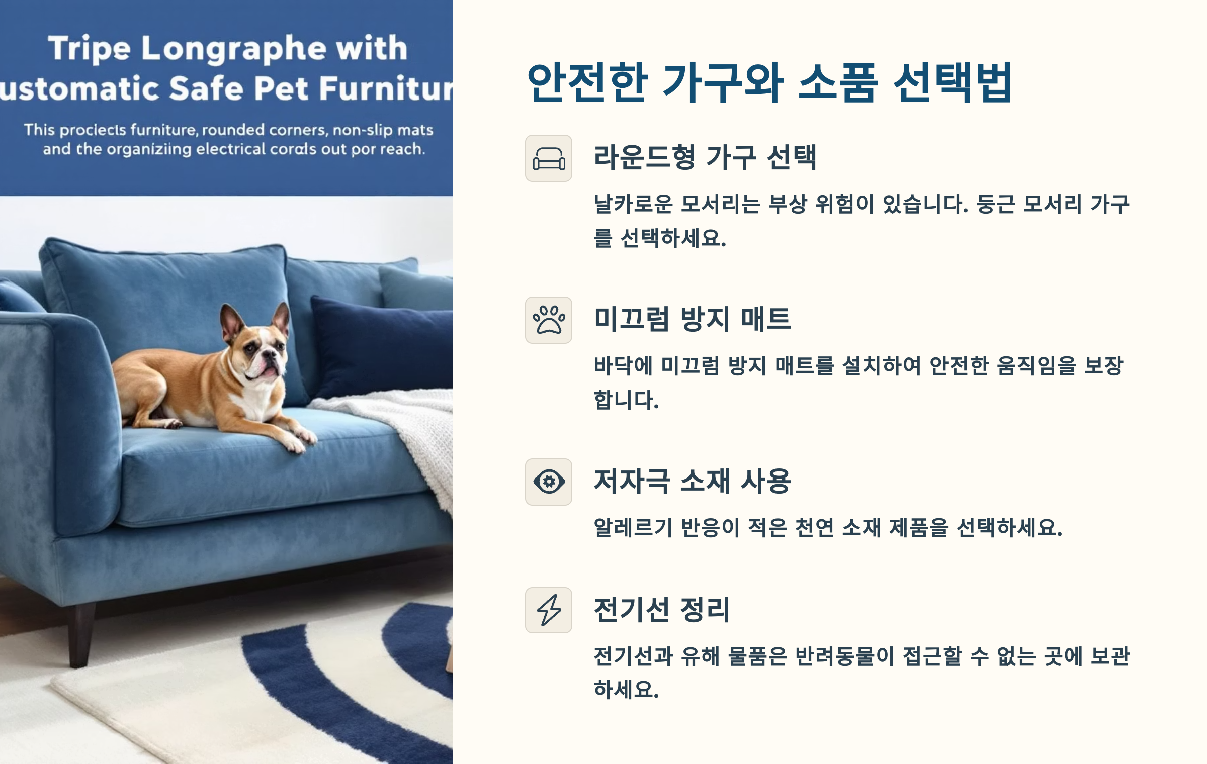 가구의 안정성과 내구성도 꼼꼼히 확인해야 해요. 반려동물이 올라타거나 기대는 가구는 충분한 무게를 견딜 수 있어야 하고, 쉽게 넘어지지 않도록 안정적인 구조여야 해요. 특히 캣 타워나 강아지 침대는 반려동물의 무게와 활동량을 고려해서 여유 있는 하중을 견딜 수 있는 제품을 선택해야 해요. 또한 조립형 가구의 경우 나사나 볼트가 느슨해지지 않도록 정기적으로 점검하고 조이는 것이 필요해요. 움직이는 부품이 있는 가구는 반려동물의 발가락이나 꼬리가 끼일 수 있으므로 특별히 주의해야 한답니다.