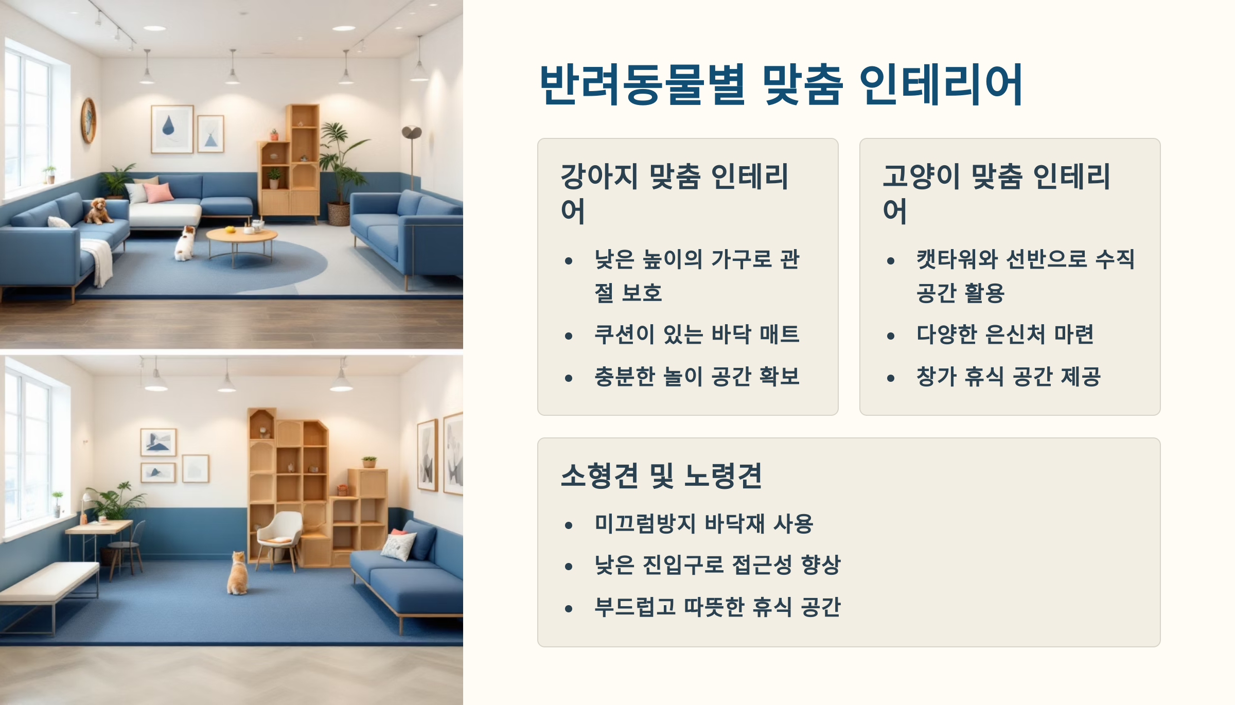 반려동물의 나이대별 인테리어 고려사항도 중요해요. 어린 강아지나 고양이는 호기심이 많고 활발하므로 안전사고 예방에 더욱 신경써야 하고, 성체가 되면 안정적이고 편안한 환경을 선호하게 되요. 노령견이나 노령묘의 경우 관절이 약해지므로 낮은 높이의 침대나 미끄럼 방지 매트, 쉽게 접근할 수 있는 급식기 등을 준비해주는 것이 좋아요. 또한 계절별로도 인테리어를 조정해야 해요. 여름에는 시원한 쿨매트나 통풍이 잘 되는 소재를, 겨울에는 따뜻한 담요나 방석을 추가로 준비해주면 반려동물이 더욱 편안하게 지낼 수 있답니다! 🐾