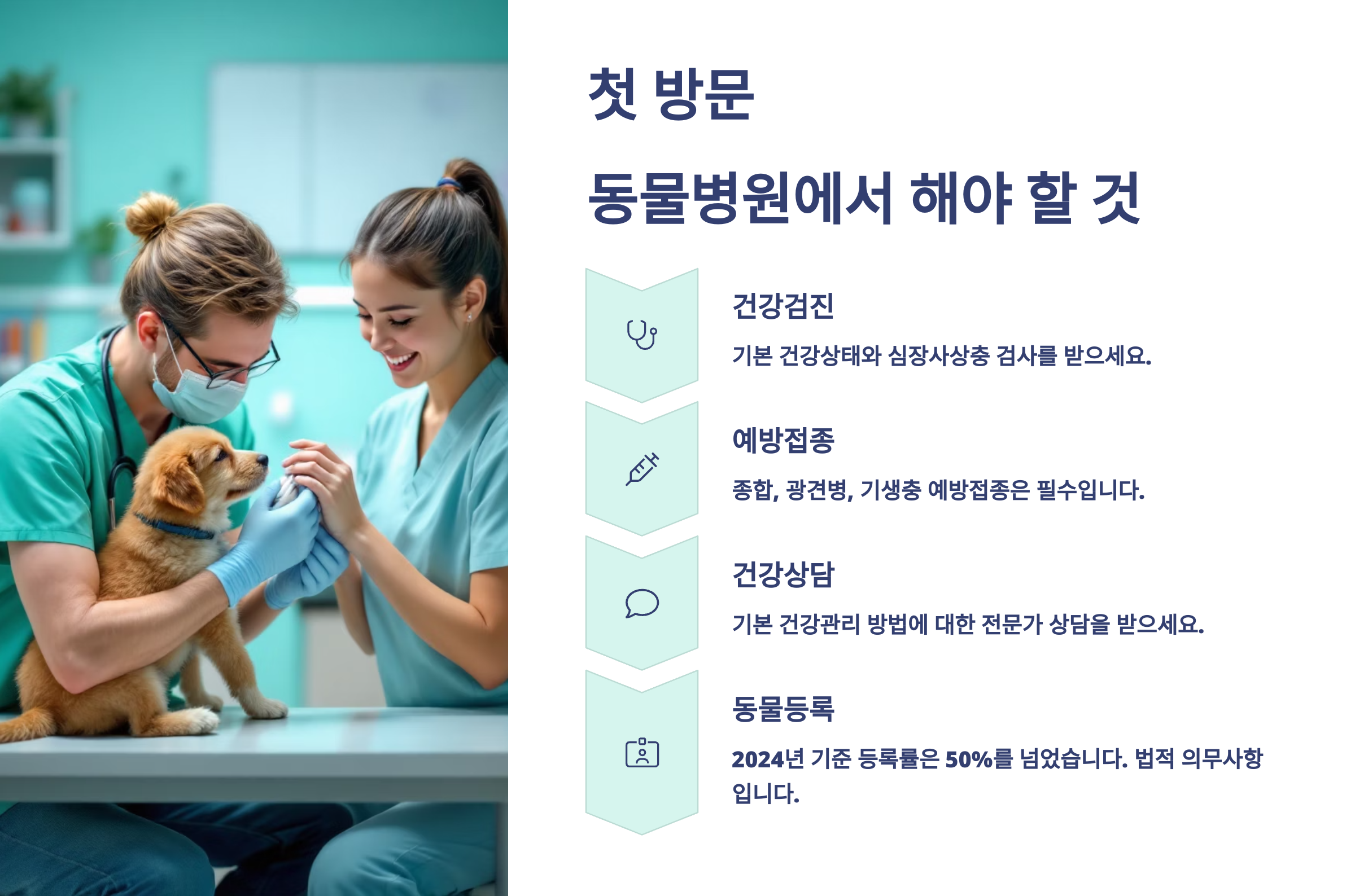 🩺 입양 후 가장 중요한 첫 스텝 중 하나! 바로 동물병원 방문이에요. 입양 당일 혹은 다음 날 내로 병원을 방문해 건강 상태를 확인하고, 기초 검진을 받아야 해요.