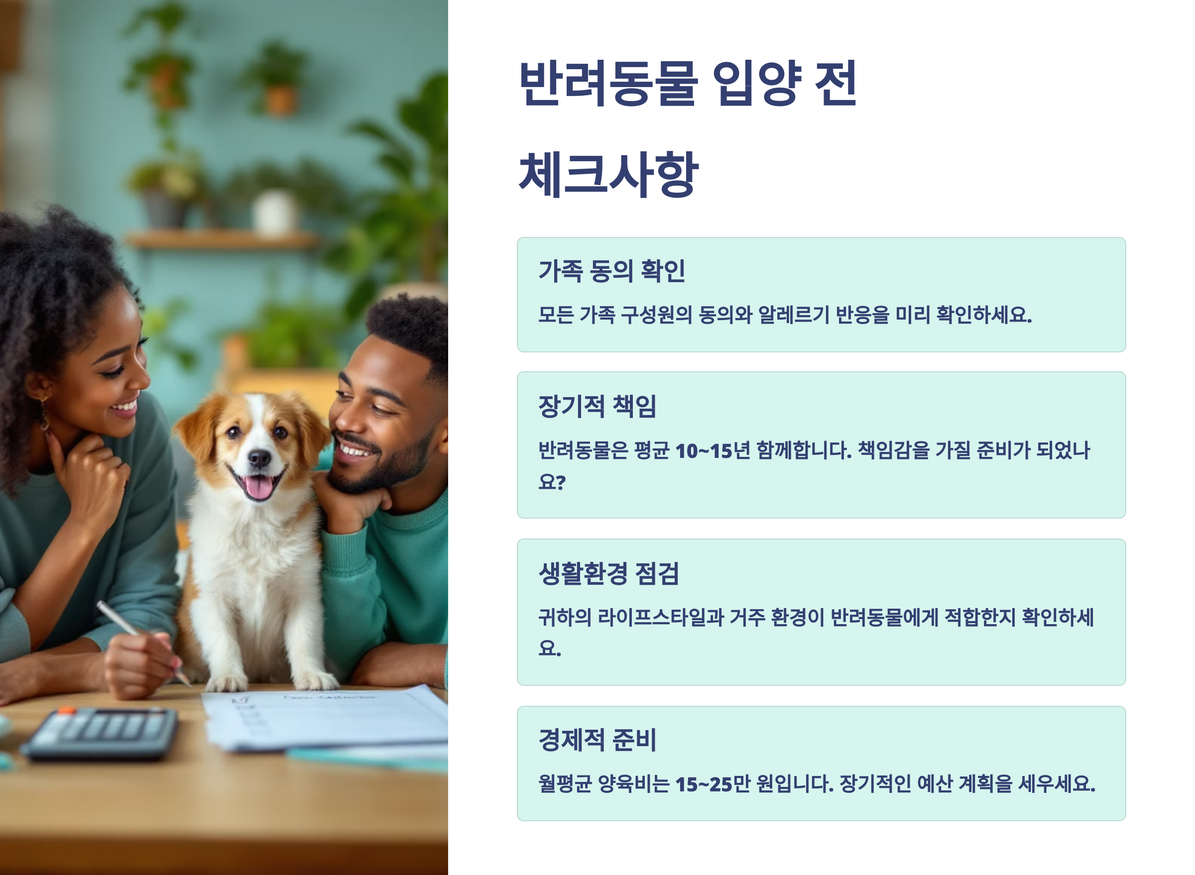 📌 반려동물 입양은 단순히 “귀여워서” 데려오는 일이 아니에요. 책임과 시간, 비용이 수반되는 장기 프로젝트라고 볼 수 있어요. 입양 전 꼭 생각해봐야 할 사항들을 먼저 정리해볼게요.