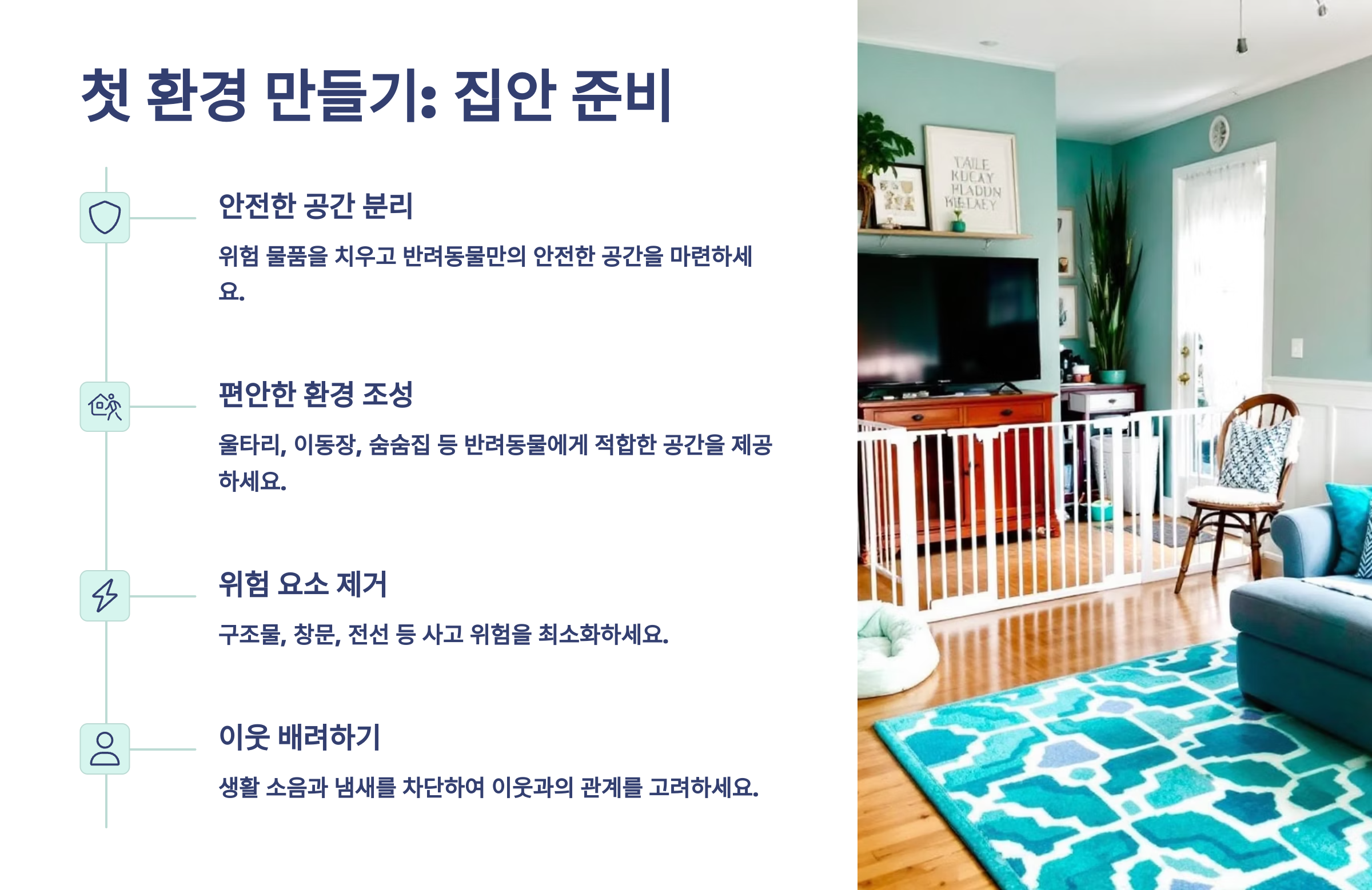 📌 다음은 반려동물을 맞이할 공간, '첫 환경' 준비하기예요. 침대, 사료, 화장실 위치까지 고민해볼게요! 🏡