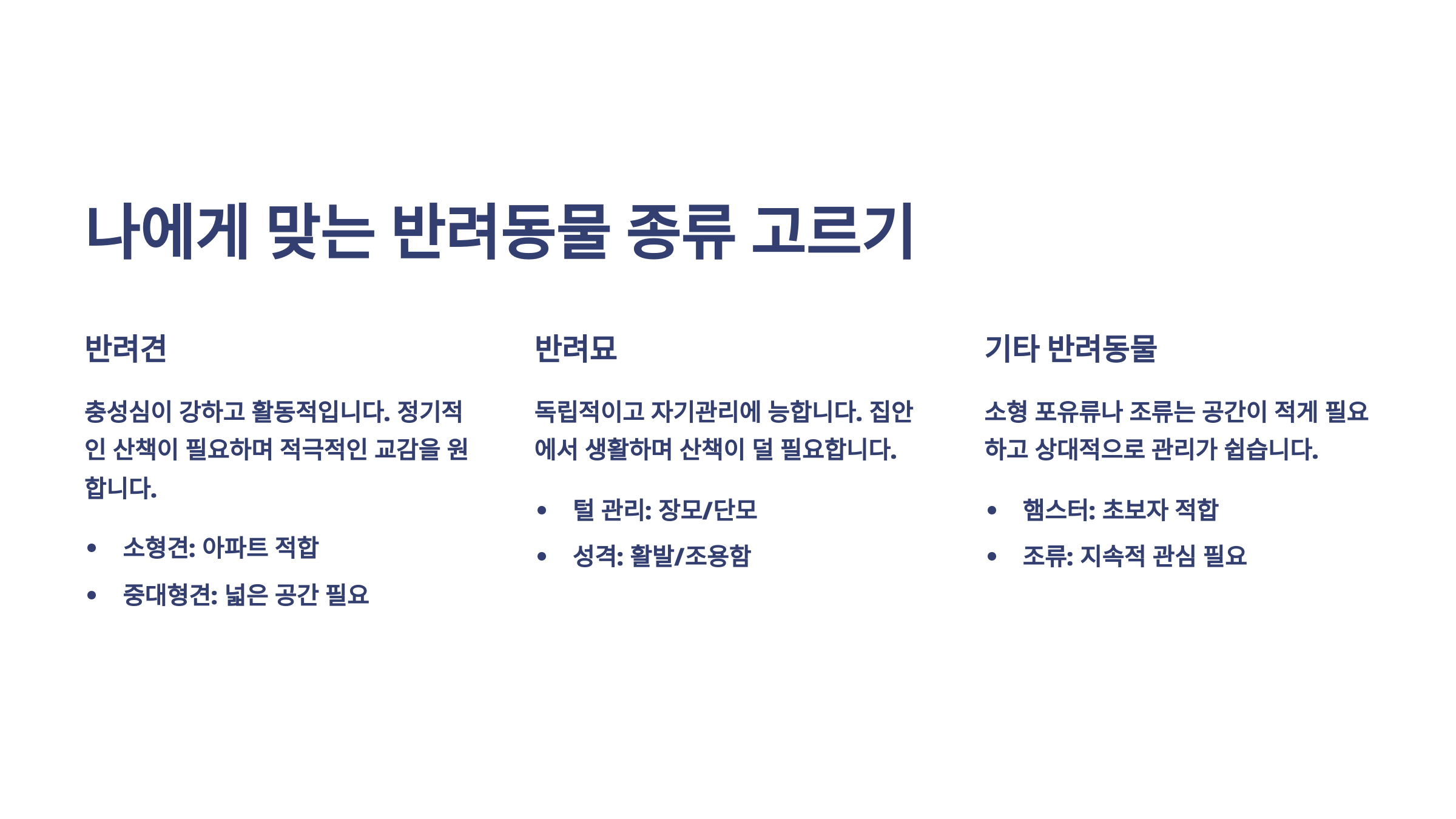 | 고양이 | 중간 (교감 시간 필요) | 조용, 독립적 | 1인 가구, 직장인 |