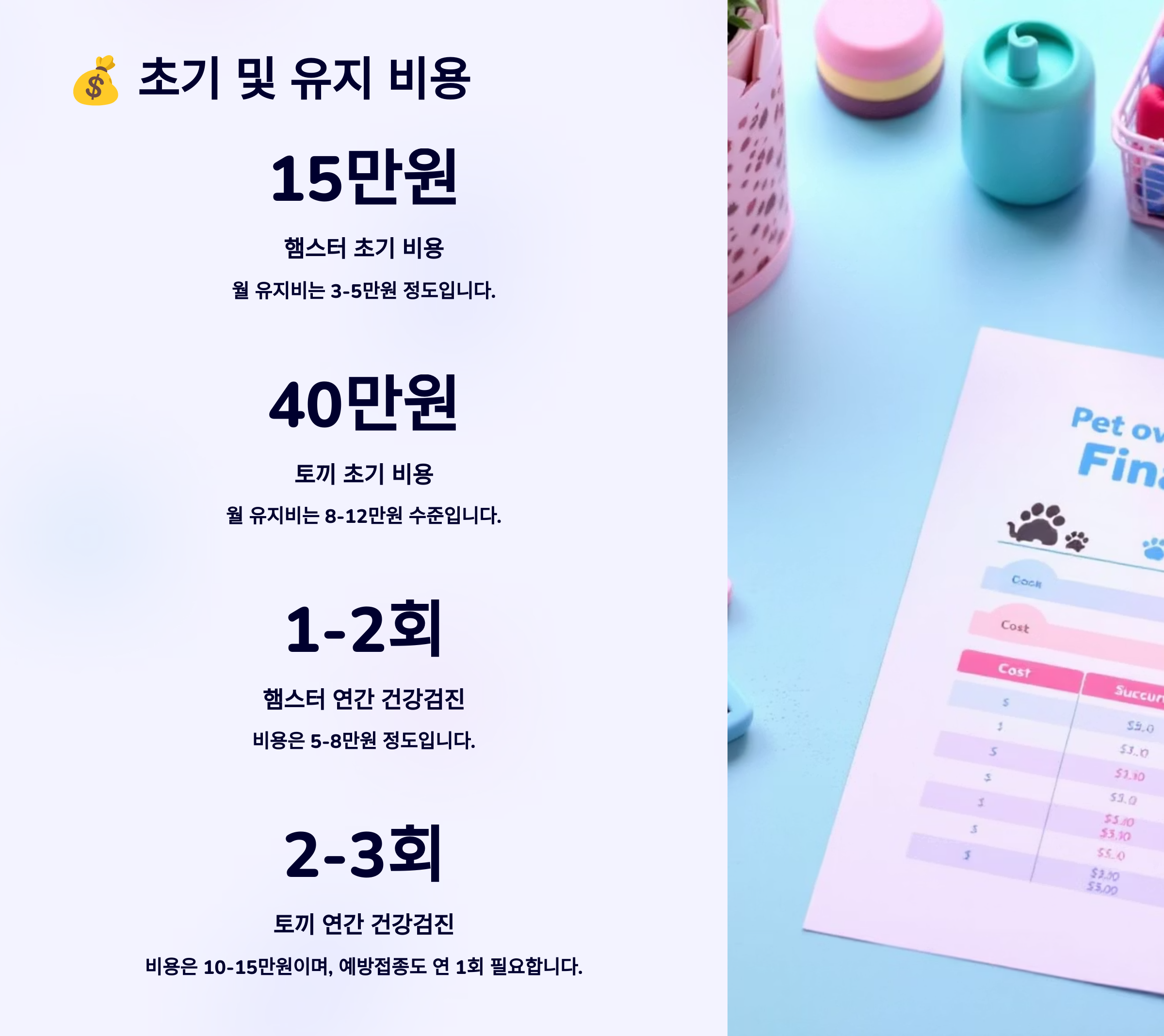 햄스터는 저예산으로 시작 가능한 반려동물이고, 토끼는 생각보다 손이 많이 가고 병원비도 고려해야 하는 동물이에요. 특히 토끼는 이빨 관리나 사료 선택, 변 상태 관찰도 중요해서 비용뿐 아니라 시간과 관심도 함께 필요하답니다. 🧾🐇