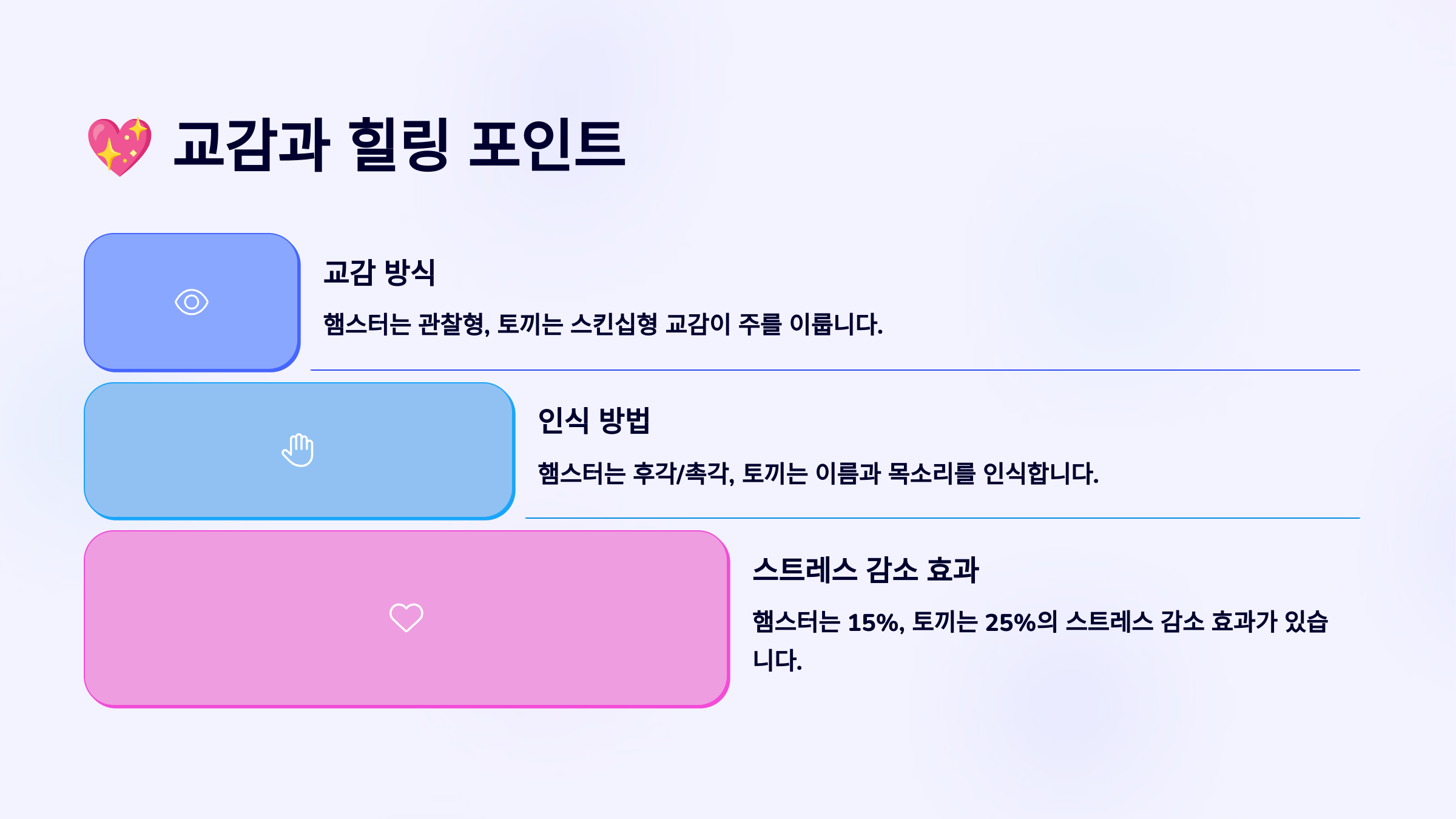 다음은 💖 교감과 힐링 포인트입니다. 두 동물과 어떻게 소통할 수 있고, 어떤 행복을 주는지 비교해드릴게요!