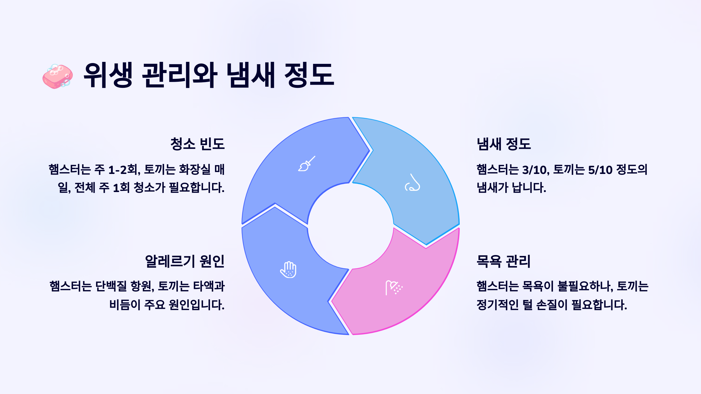 다음은 🧼 위생 관리와 냄새 정도입니다. 두 동물 모두 깔끔하지만, 관리 방법과 냄새 차이는 꽤 커요!